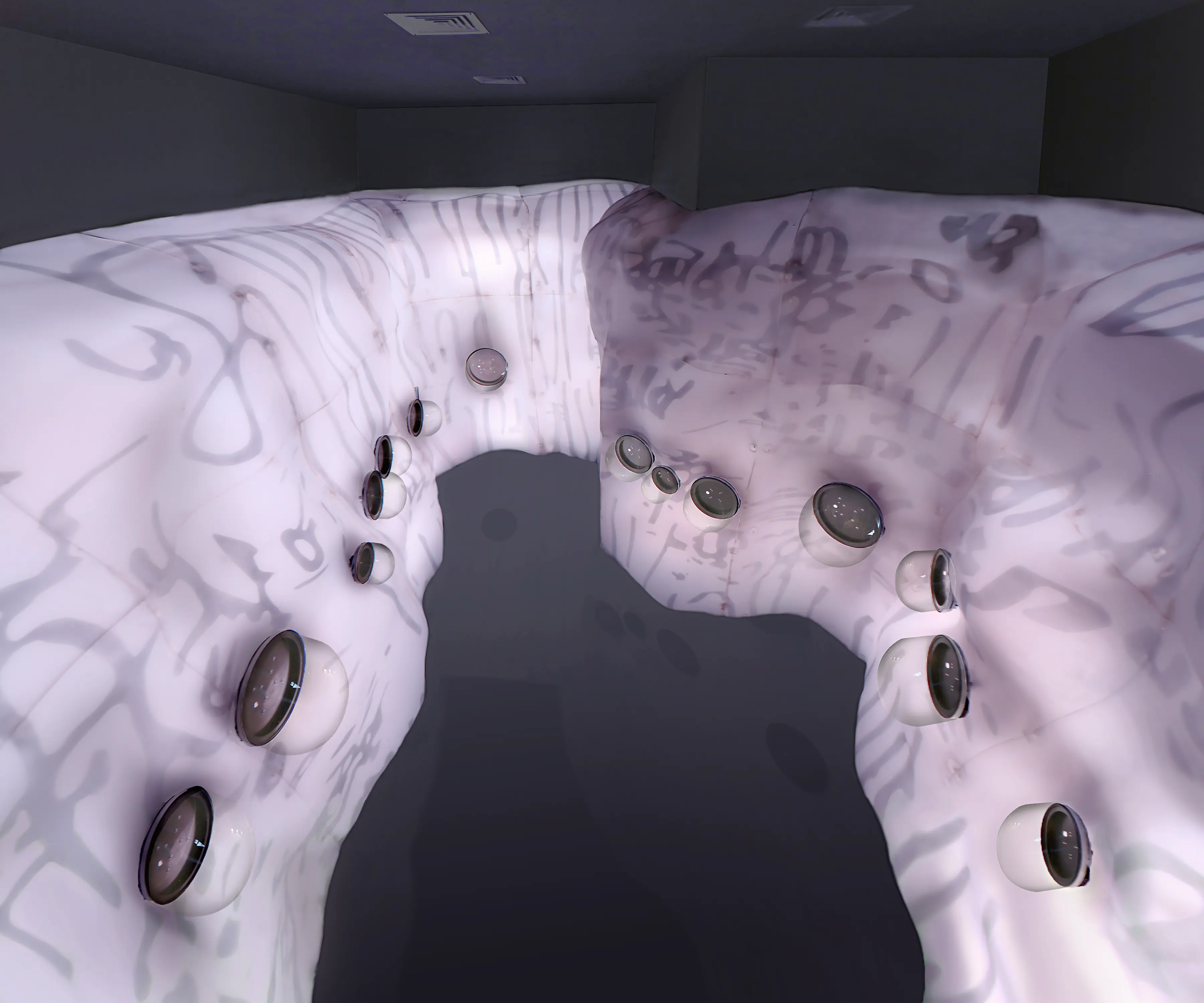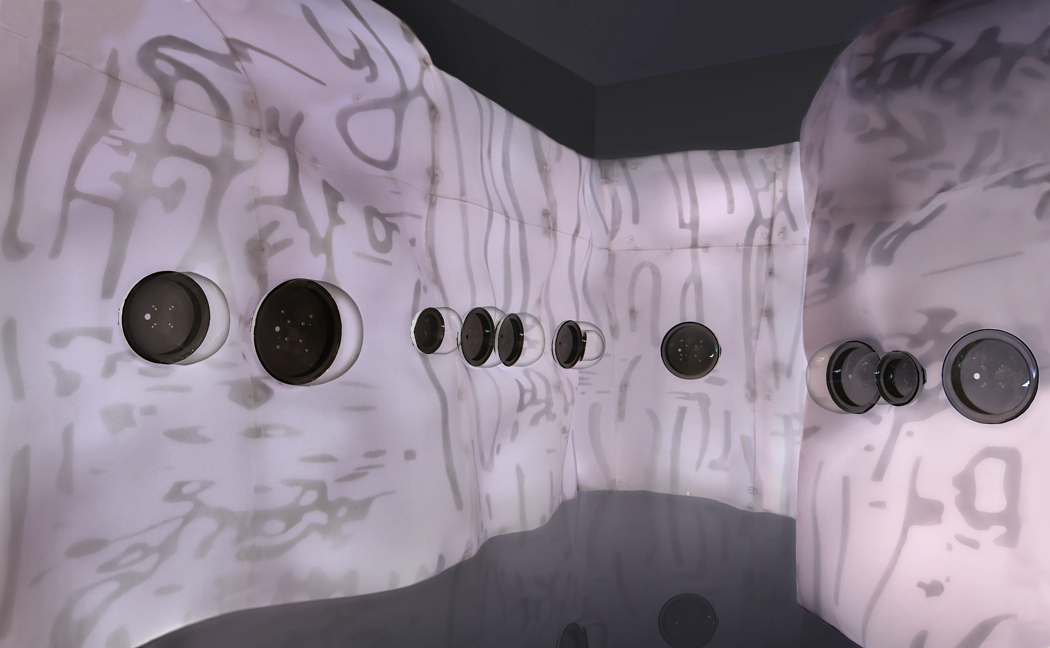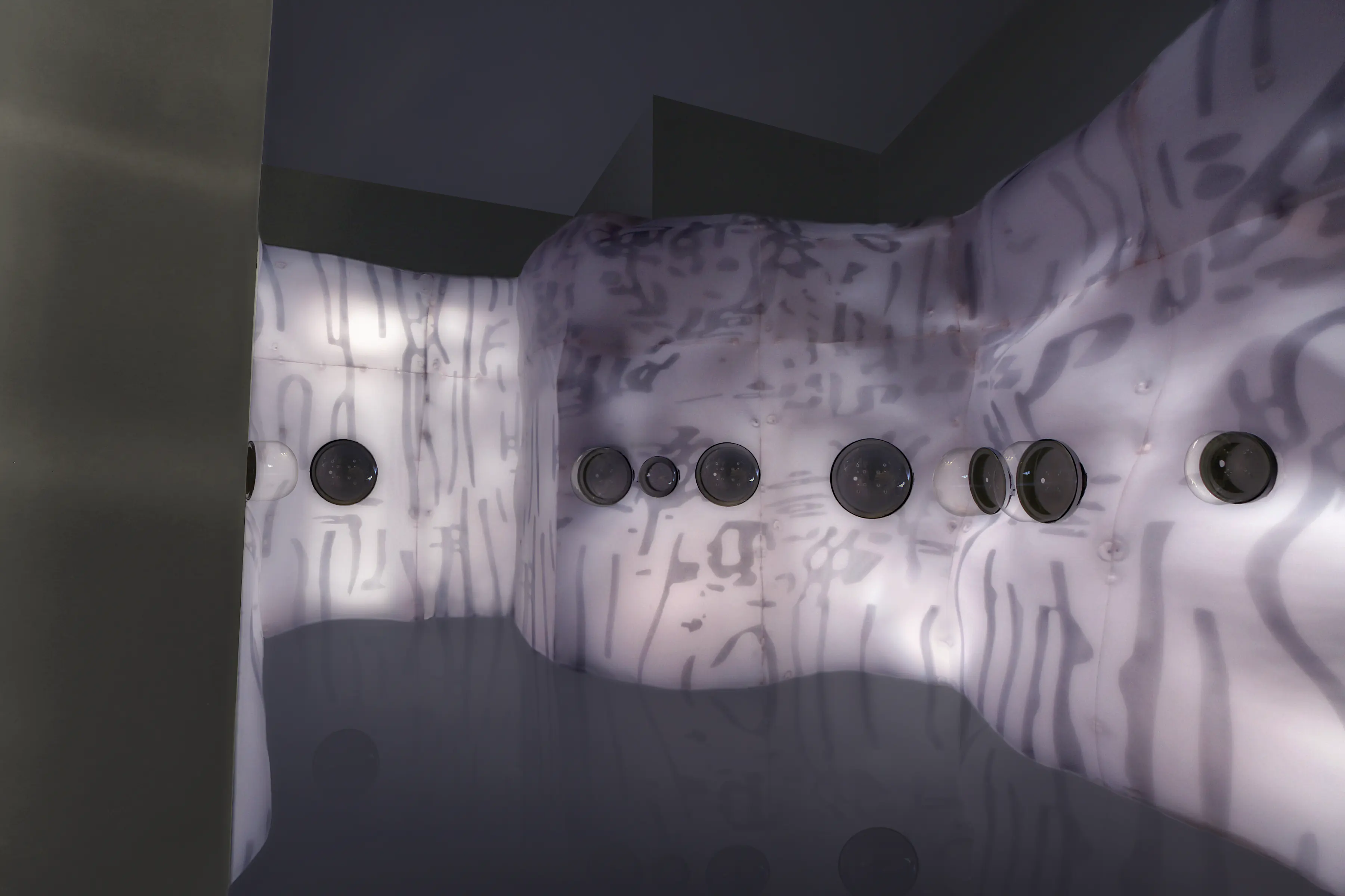 Media: LEDs, diffusion material, vinyl, custom lighting sequence, electrical hardware.