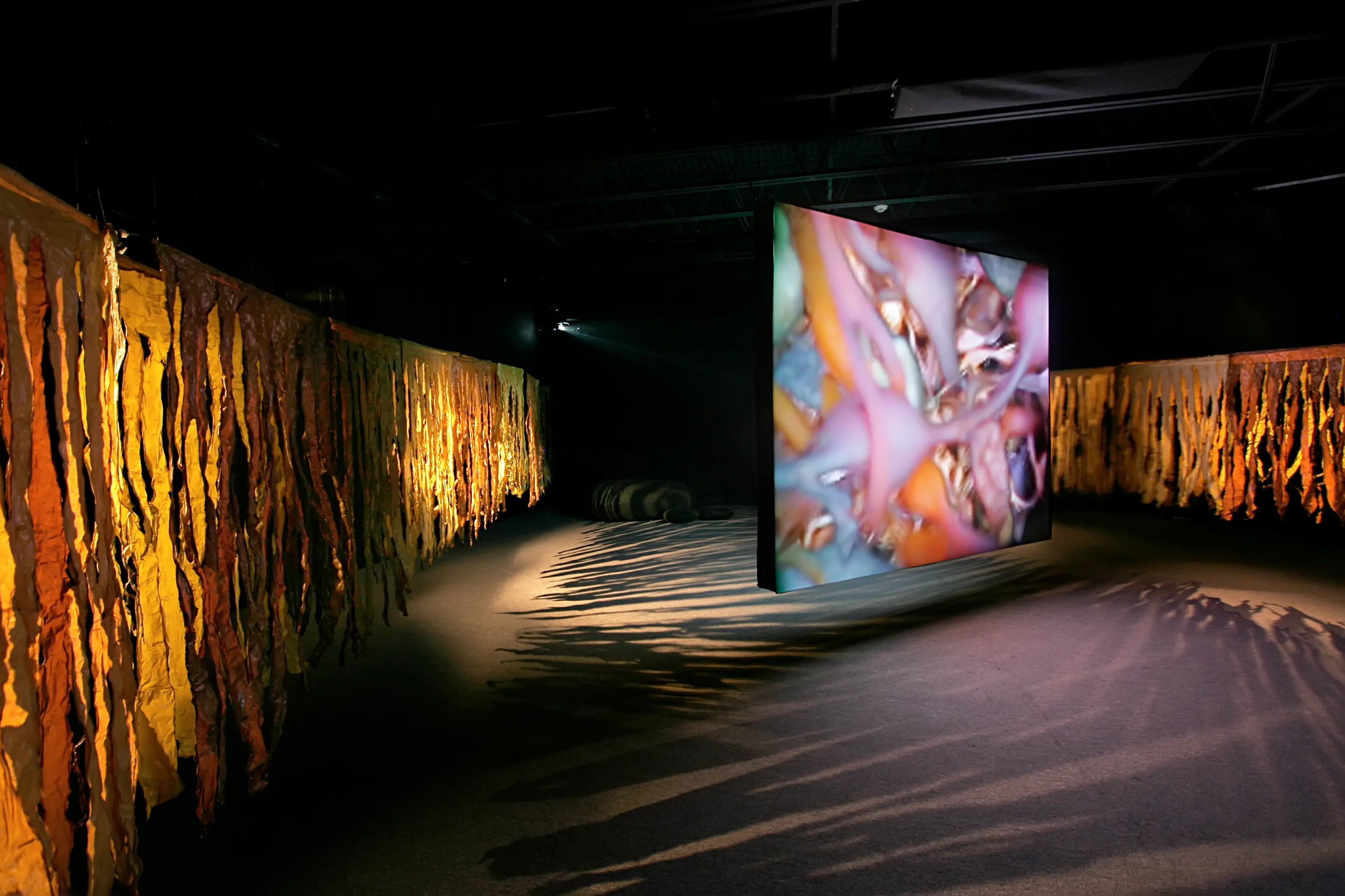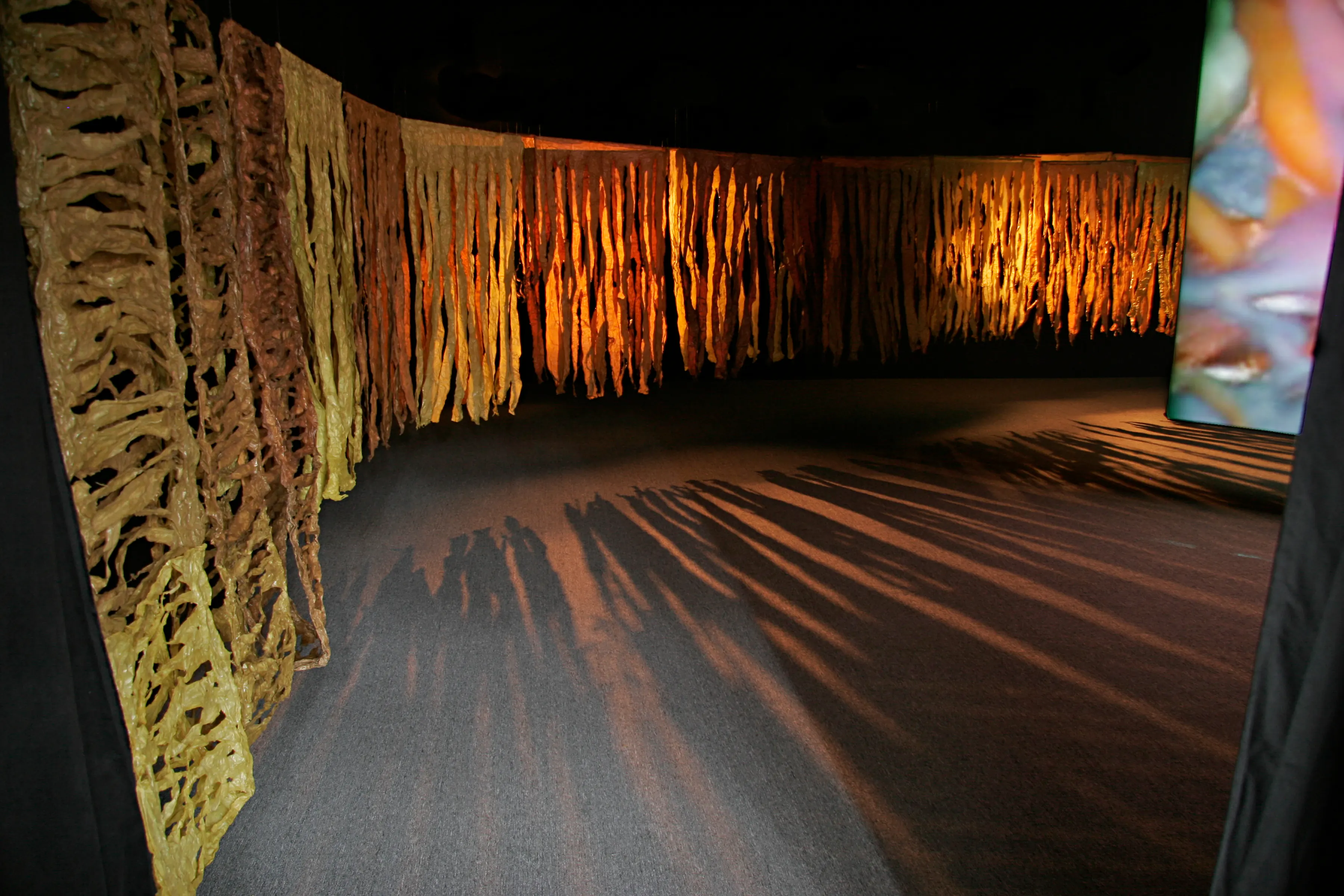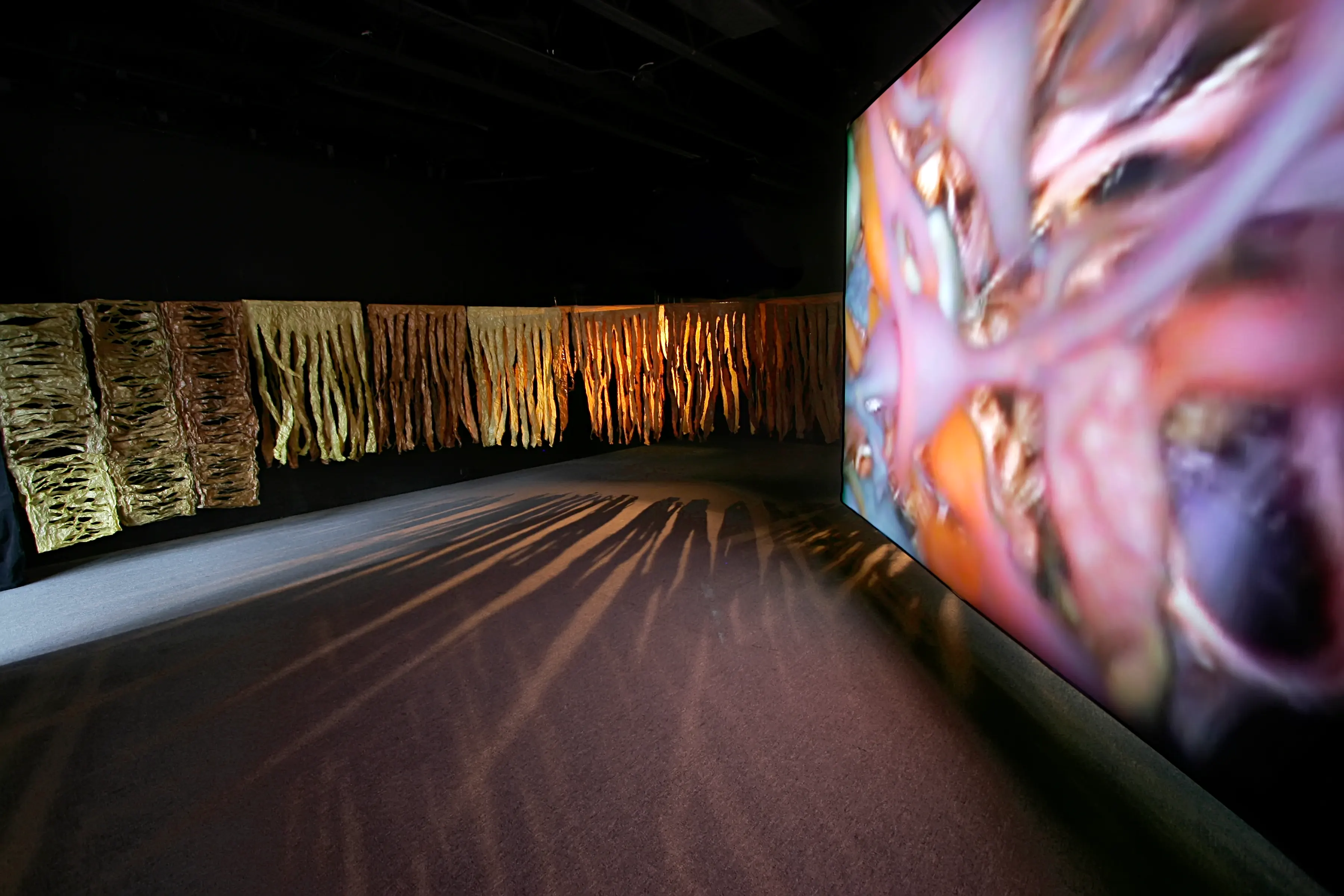 For this installation, Rootless Algas, large multi-colored algae have been made by casting translucent abaca sheets into molds that are then hung from ceiling to floor. The work intends to express certain feelings of isolation and attempts to convey characteristics of the actual experience rather than explorations or descriptions. I have removed the plants from their original context and reinvented them to highlight the dynamic between nature and human beings. The configurations of the area require people to experience their surroundings from multiple viewpoints. That spatial virtuality is augmented with a video projection and soundtrack by Icelandic composer Hilmar Örn Hilmarsson. In addition, viewers will have to find and create their own space and in doing so they will recreate on a small scale the limitless scope of the natural world.