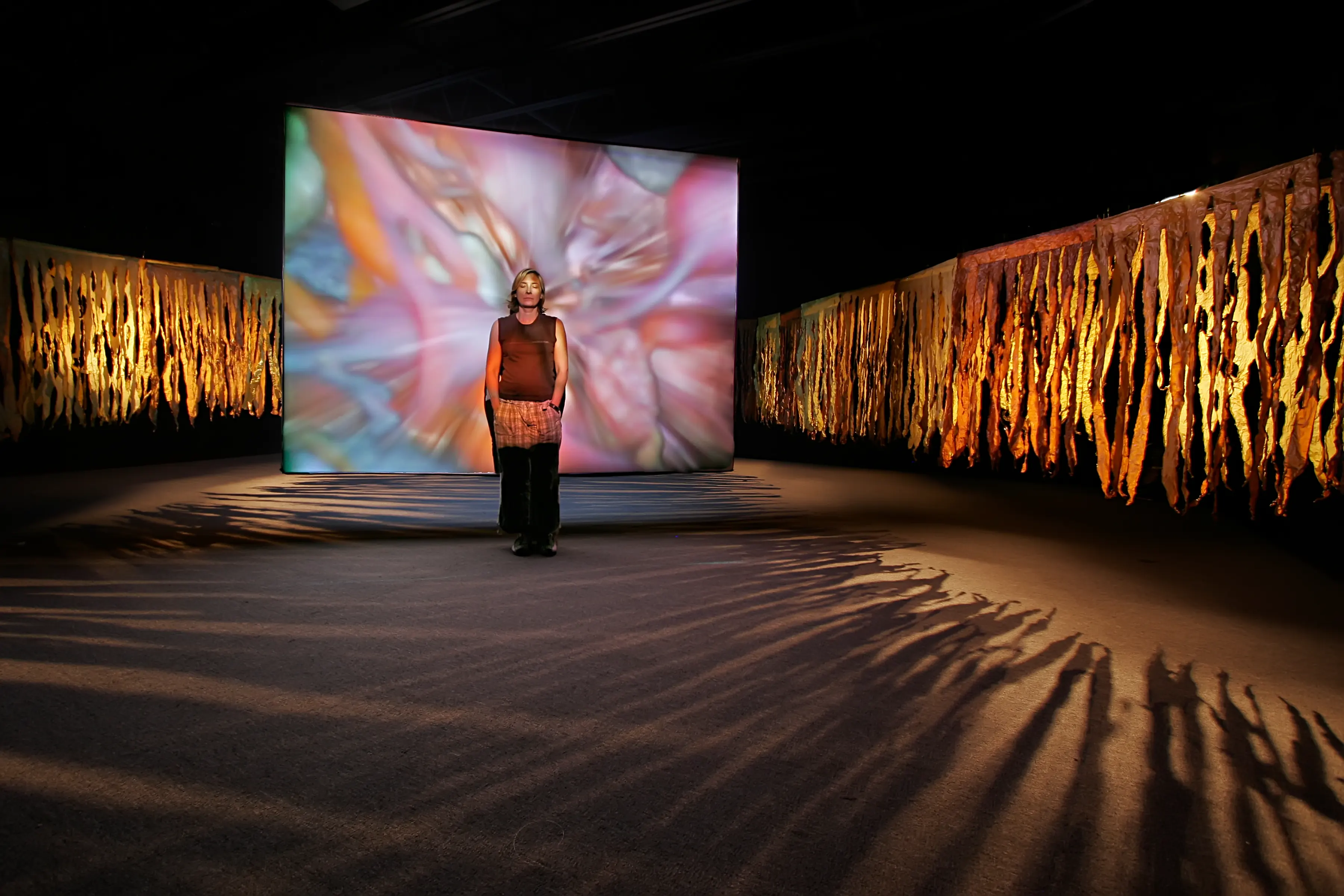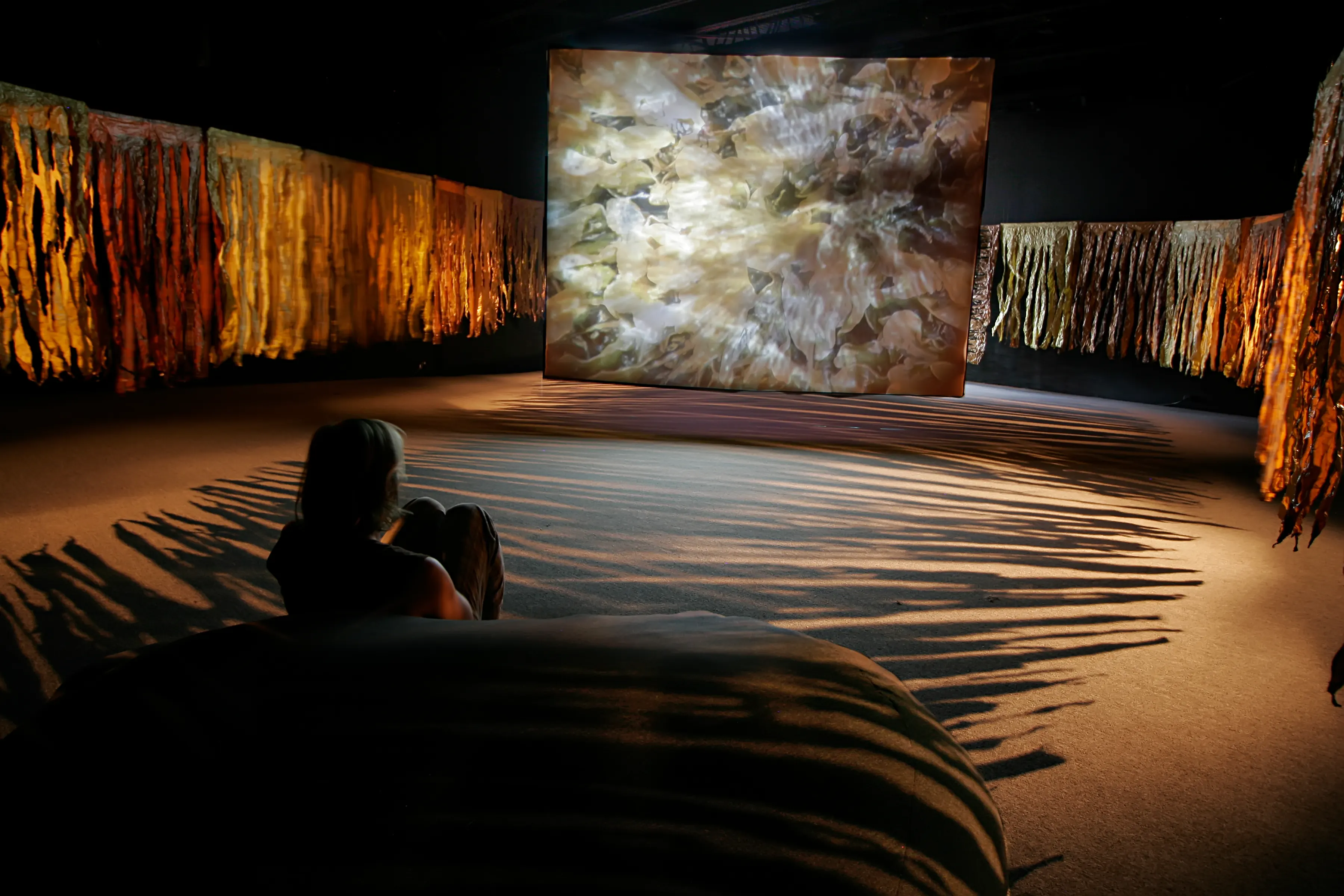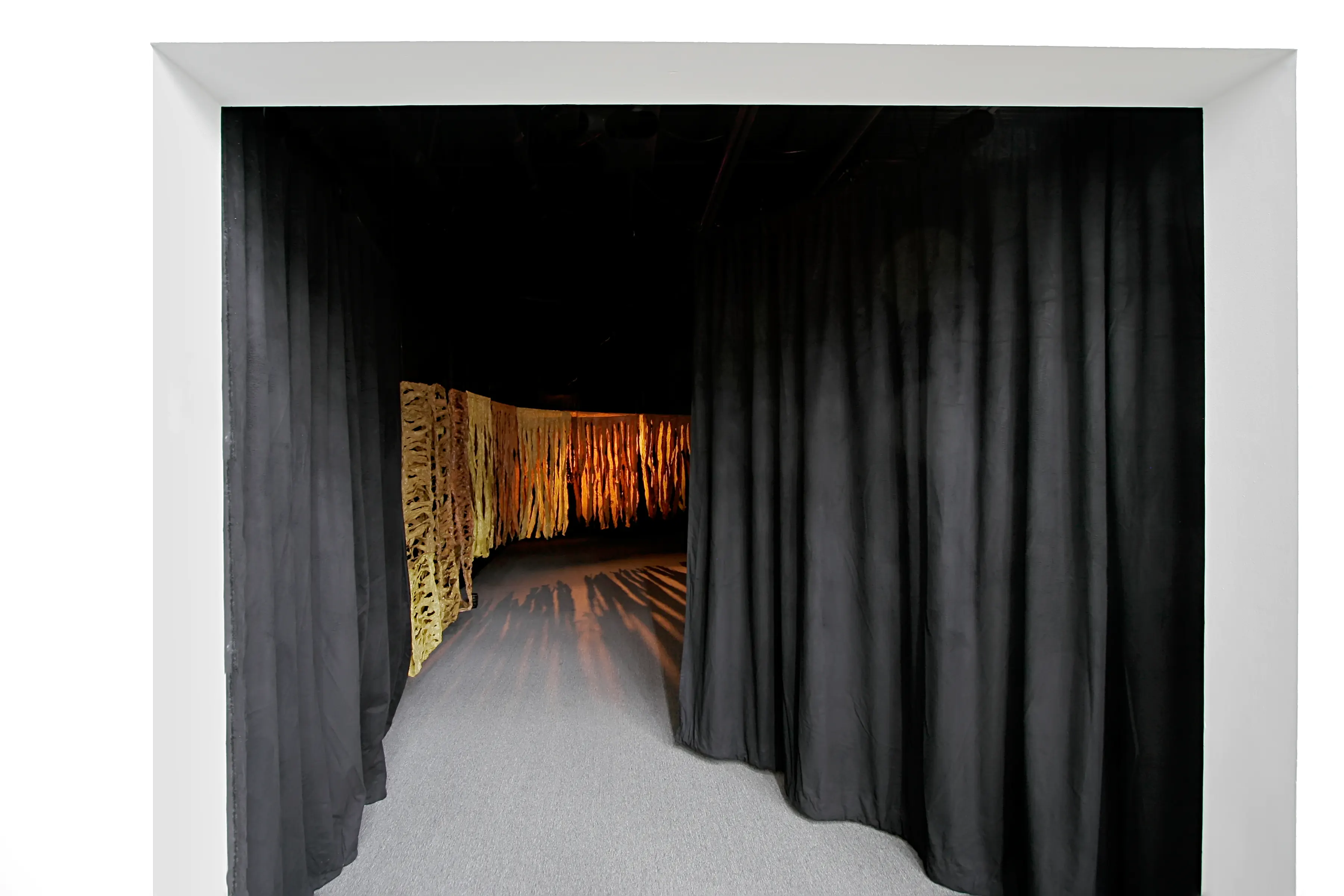For this installation, Rootless Algas, large multi-colored algae have been made by casting translucent abaca sheets into molds that are then hung from ceiling to floor. The work intends to express certain feelings of isolation and attempts to convey characteristics of the actual experience rather than explorations or descriptions. I have removed the plants from their original context and reinvented them to highlight the dynamic between nature and human beings. The configurations of the area require people to experience their surroundings from multiple viewpoints. That spatial virtuality is augmented with a video projection and soundtrack by Icelandic composer Hilmar Örn Hilmarsson. In addition, viewers will have to find and create their own space and in doing so they will recreate on a small scale the limitless scope of the natural world.
