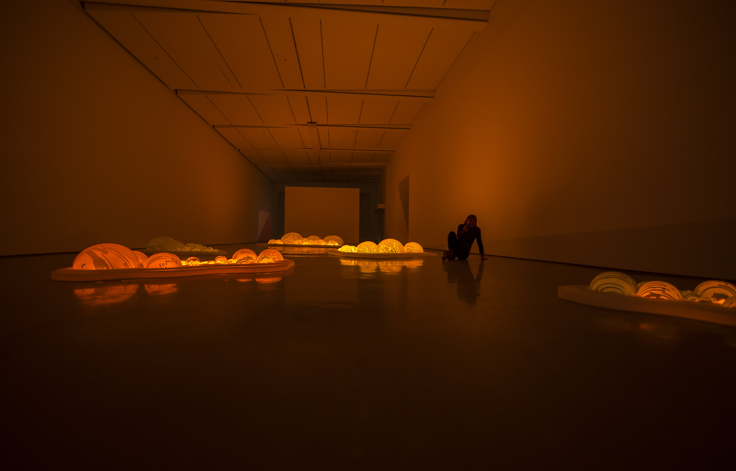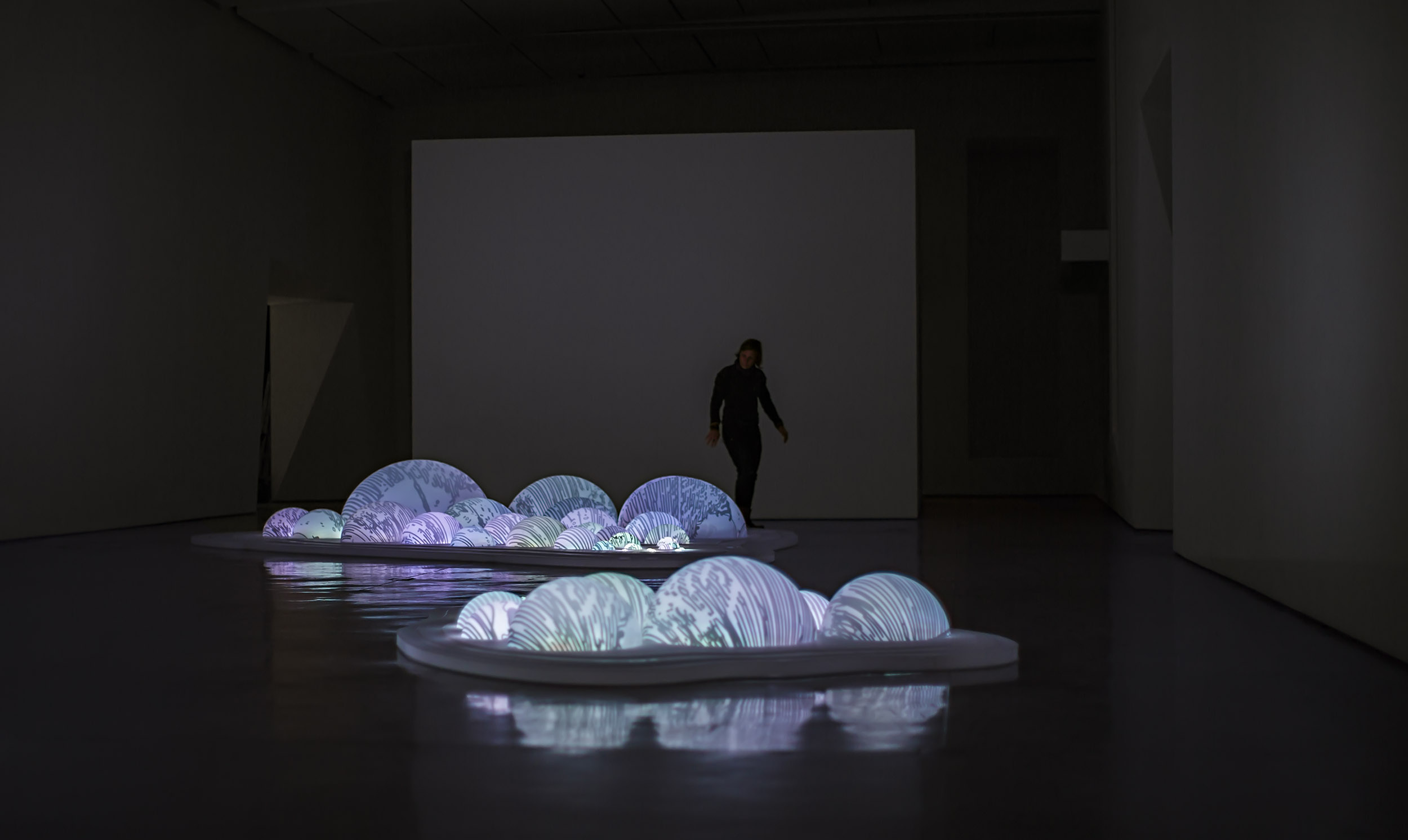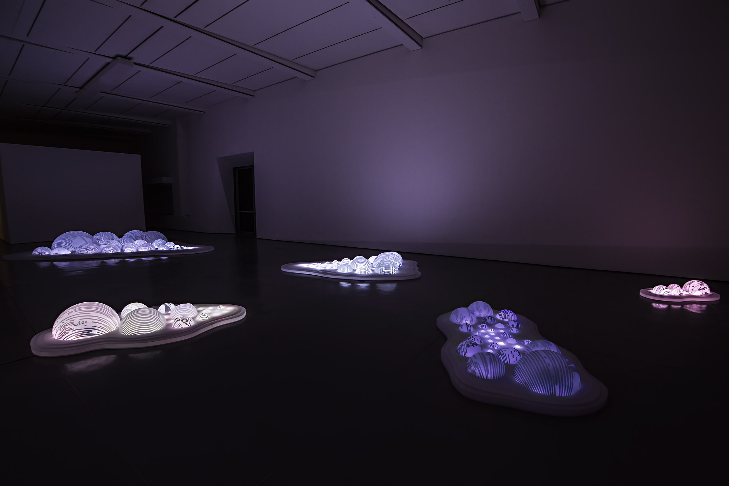 LIGHT BETWEEN THE ISLANDS, a continuation of the UROS HOUSE series. It is an installation by Grimanesa Amoros includes glowing dorms as islands of varying sizes, whose interiors are illuminated by a programmed lighting sequence.