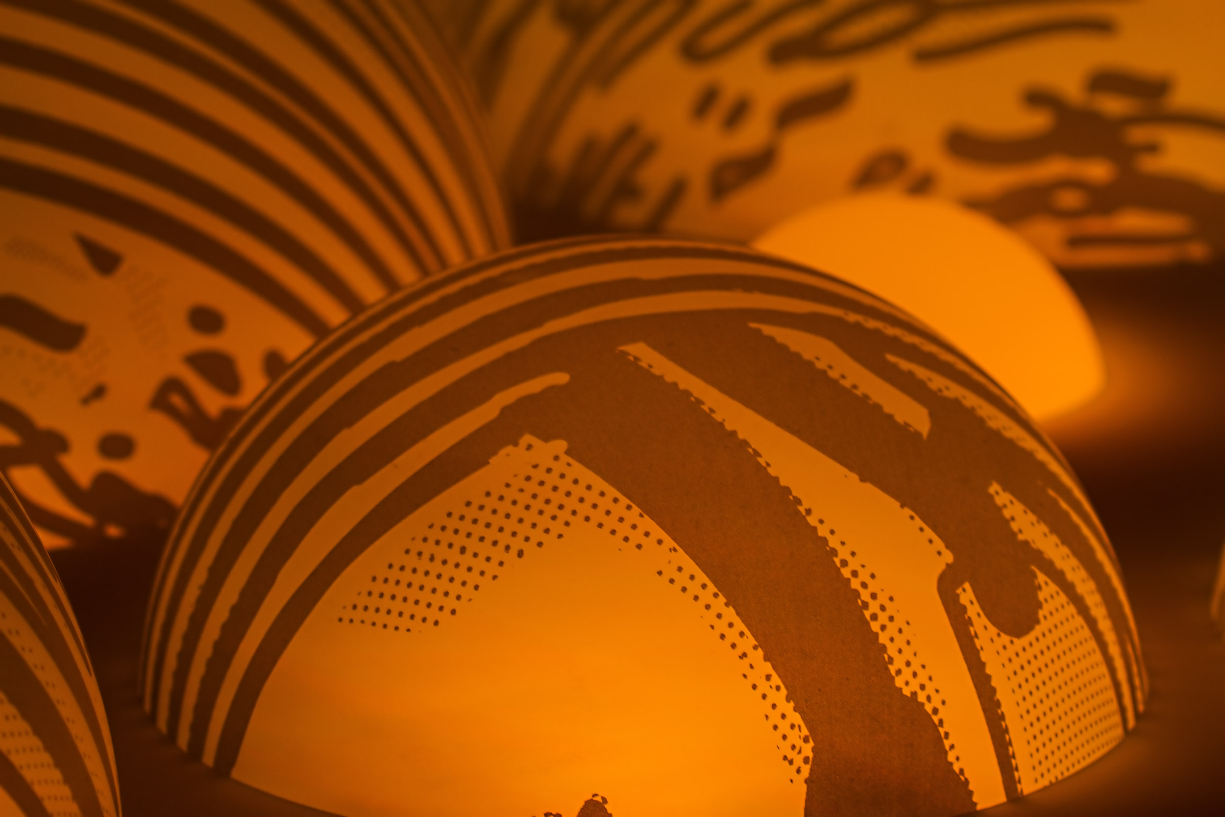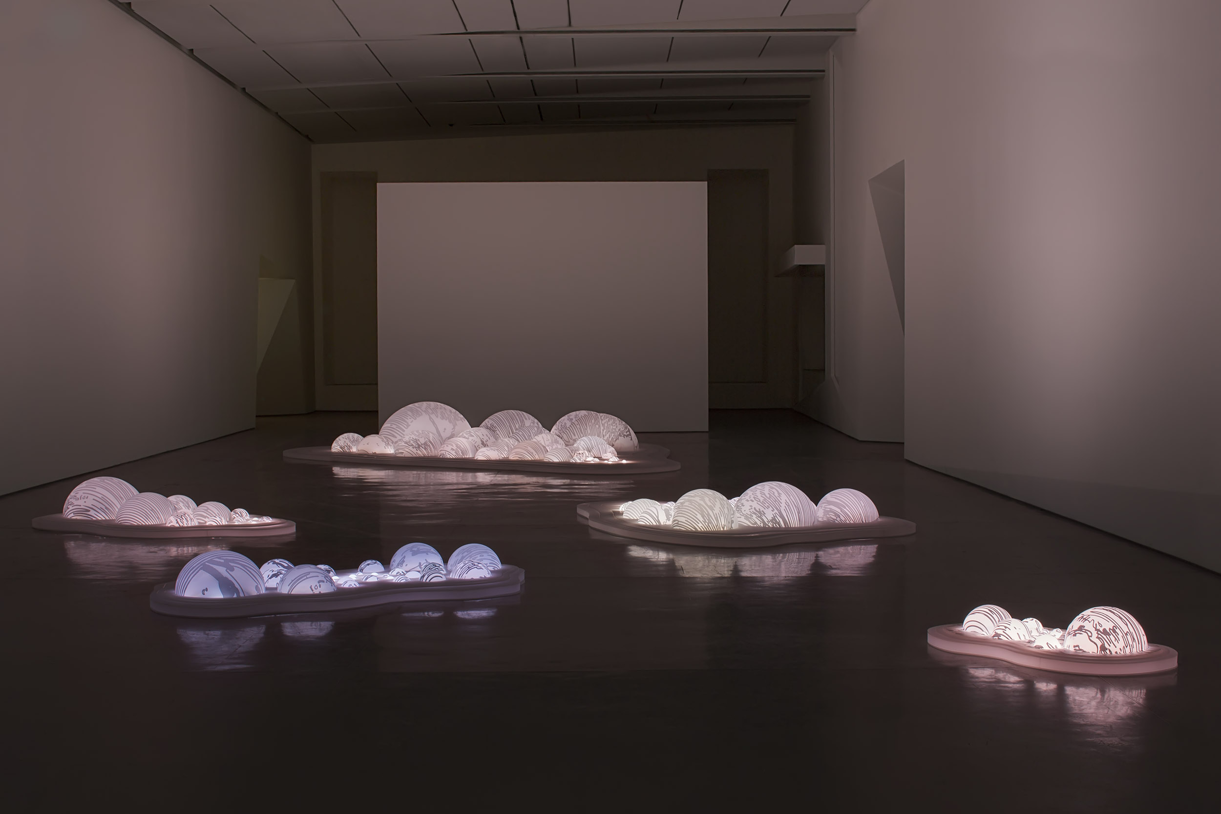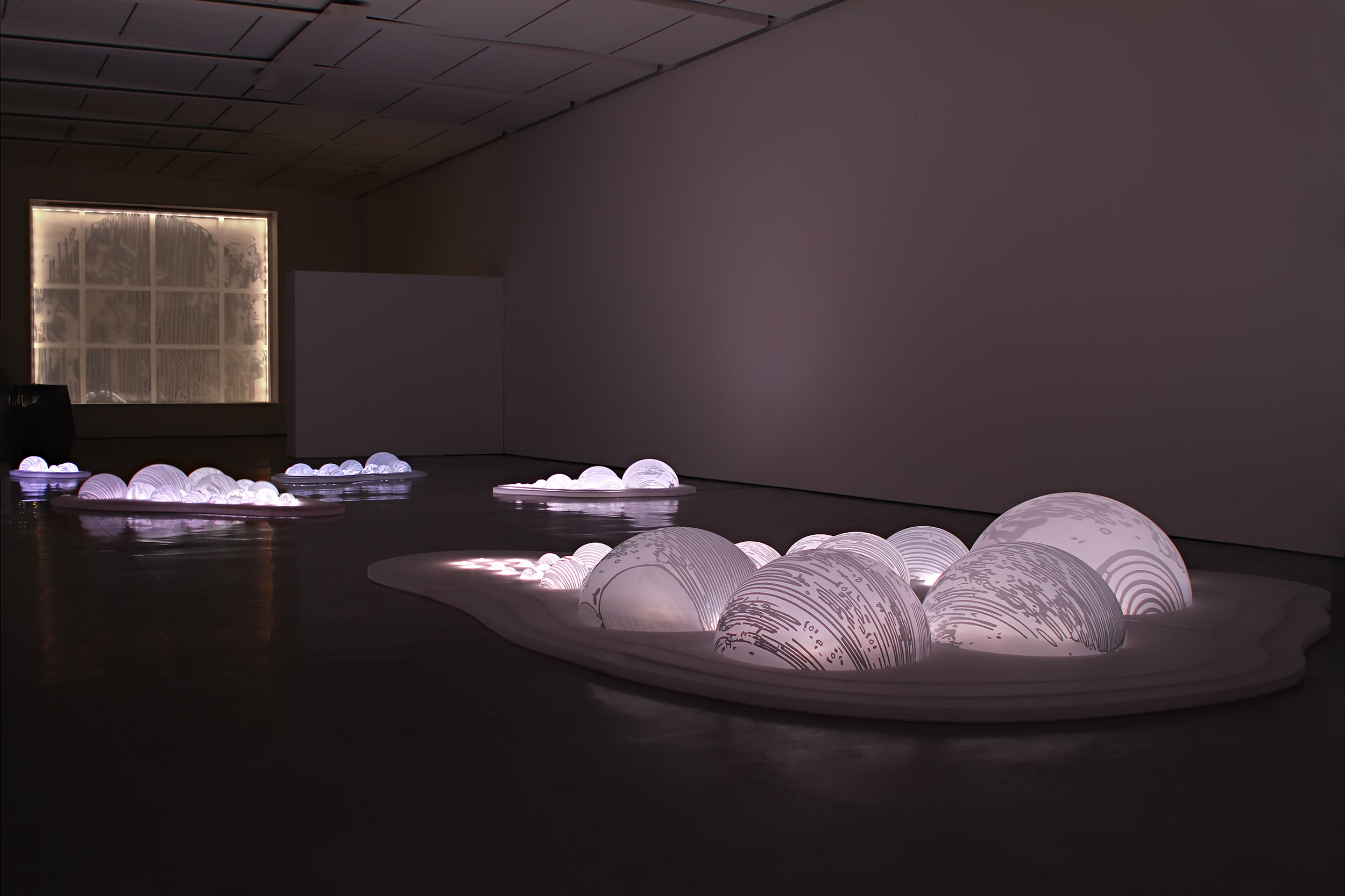 Description: Light Between The Islands is an installation that includes islands of shimmering white bubbles, composed of various sizes, handmade from a different mold, and with drawings silkscreened over each of their surfaces. The bubbles that form the installations are a part of modular units and layers. Amoros multiplies and arranges the units into structures that could become monumental in scale, all the while appearing to be weightless.