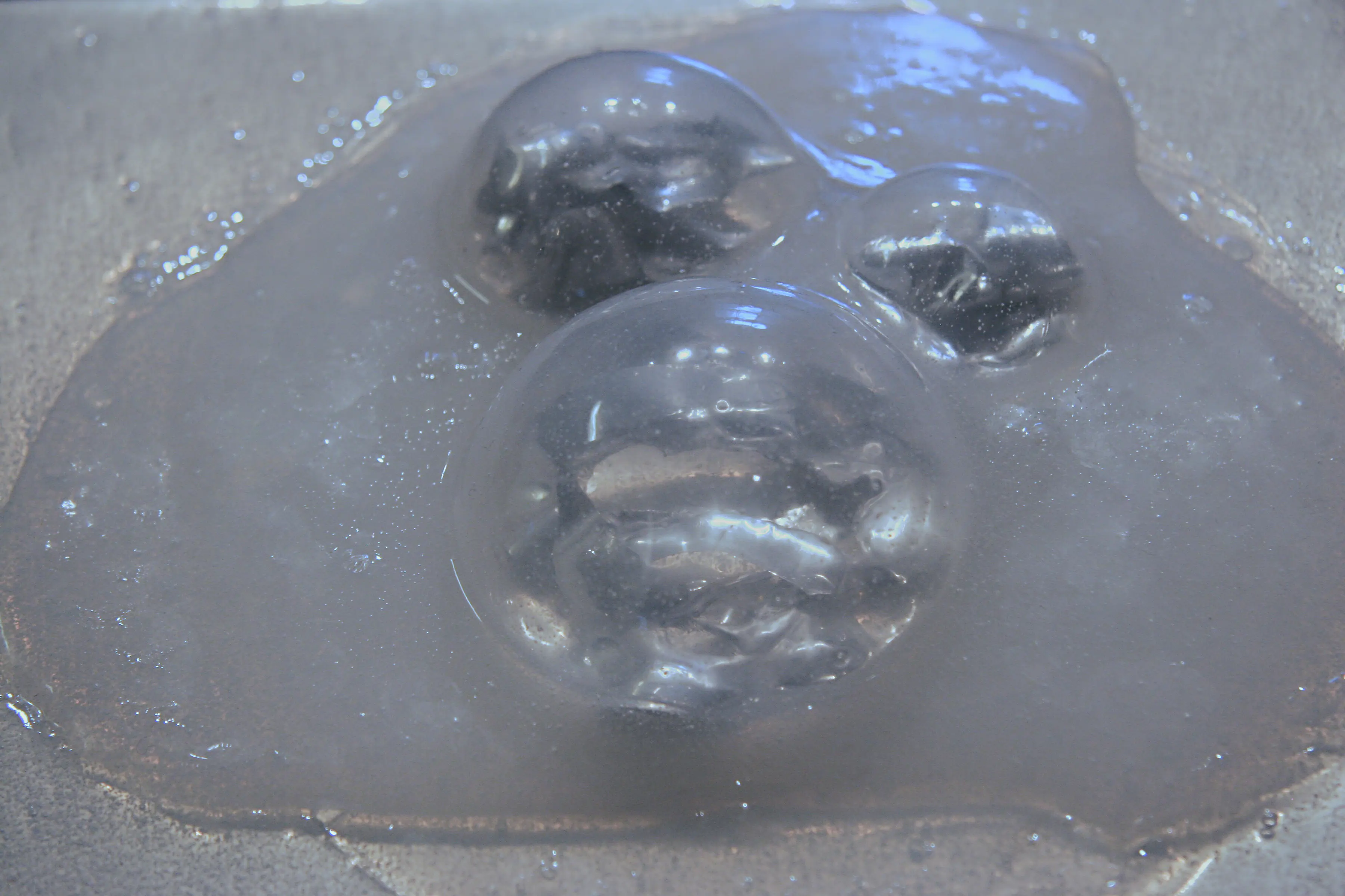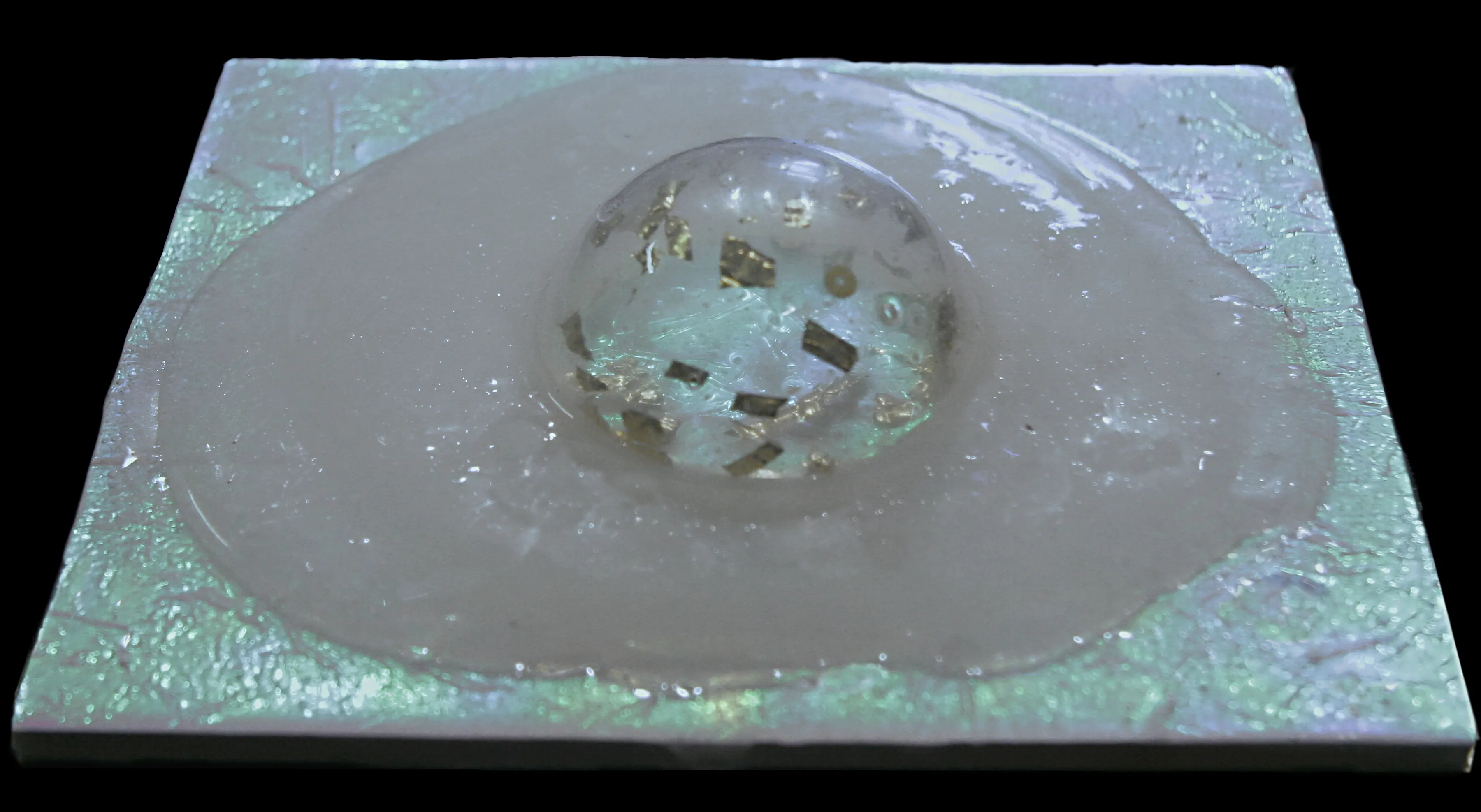 In this work, she draws on the ocean as both metaphor and material memory. The bubbles and foam that rise and dissolve on the shoreline echo cycles of economic expansion and collapse. They swell with light and movement, yet their beauty is transient, disappearing as quickly as it appears. This natural rhythm mirrors the way society swells with illusion and manufactured promise, only to deflate and return to stillness.