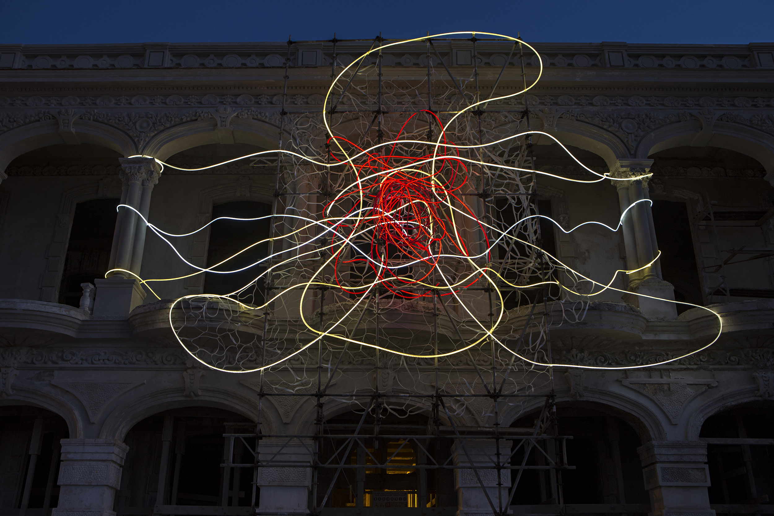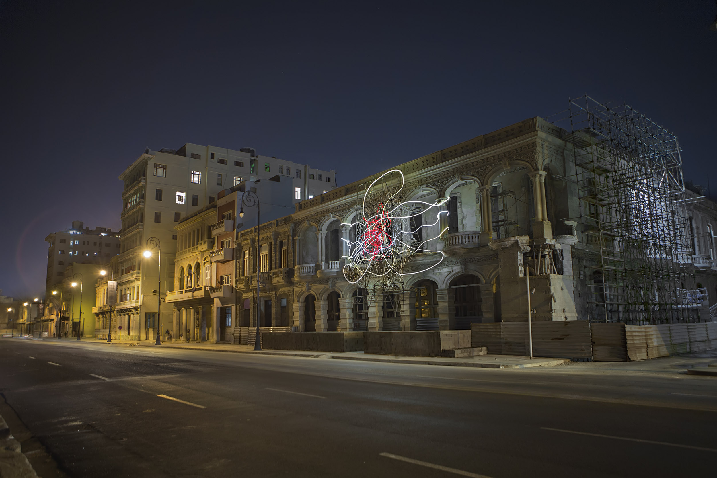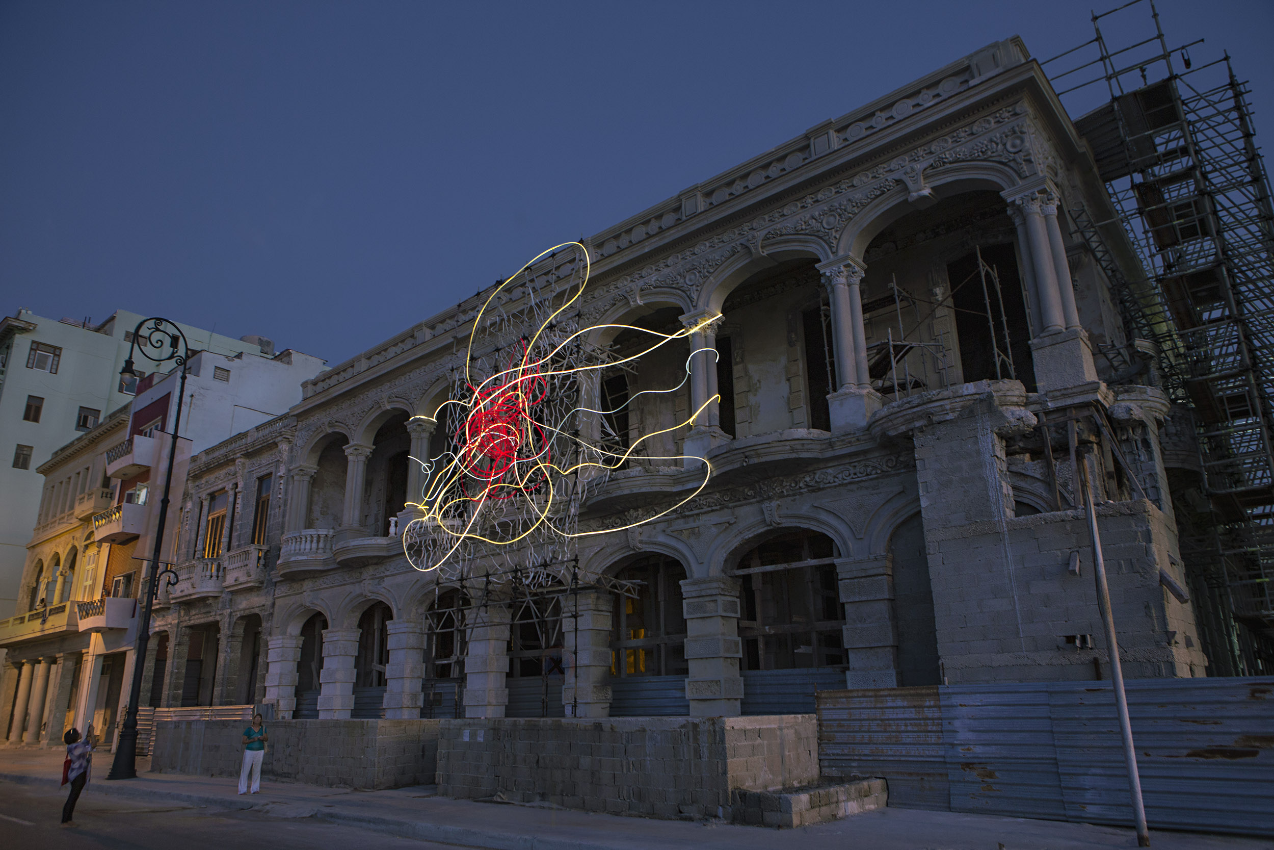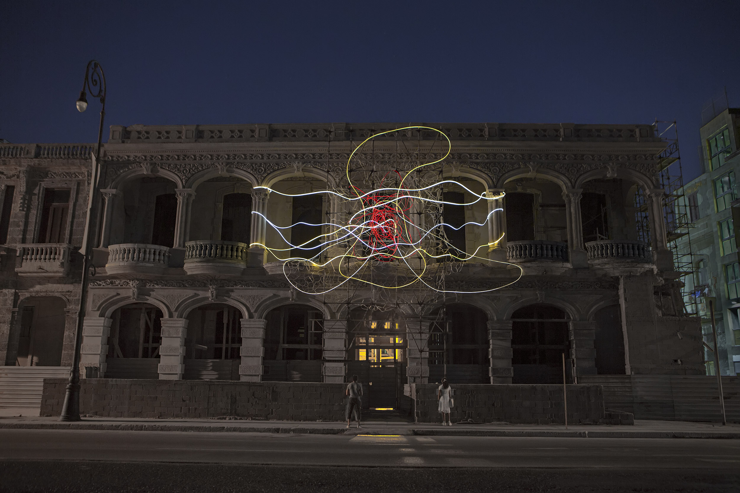 Description: The 13th Havana Biennial, the most significant visual arts event in Cuba, transforms the island’s capital city and creates a “cultural corridor” simultaneously; because of this,  creators and the public interact. Therefore, working with the Detras del Muro organization, Grimanesa Amoros created MARIPOSA DORADA, a monumental light sculpture installation for the 13th Havana Biennial.