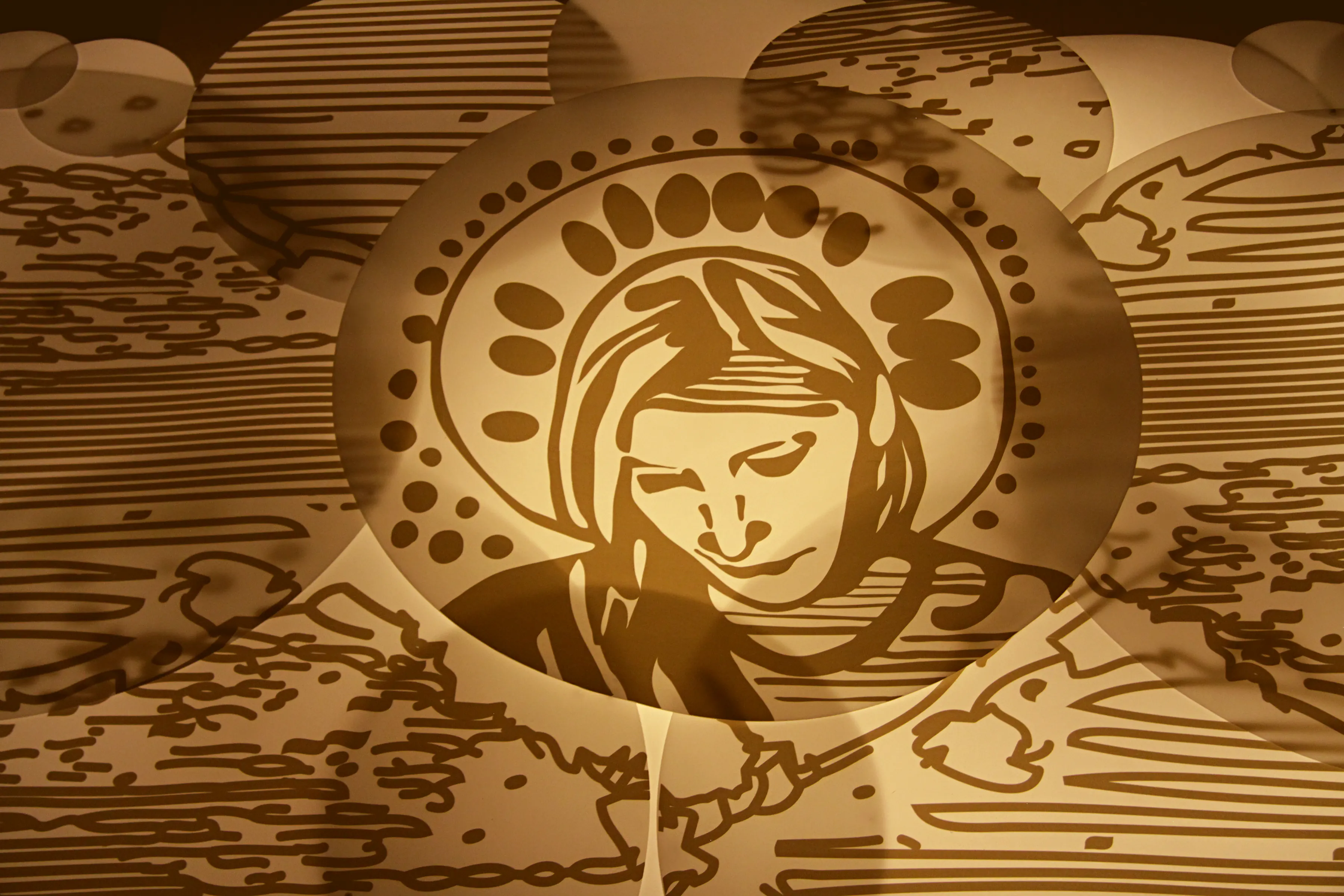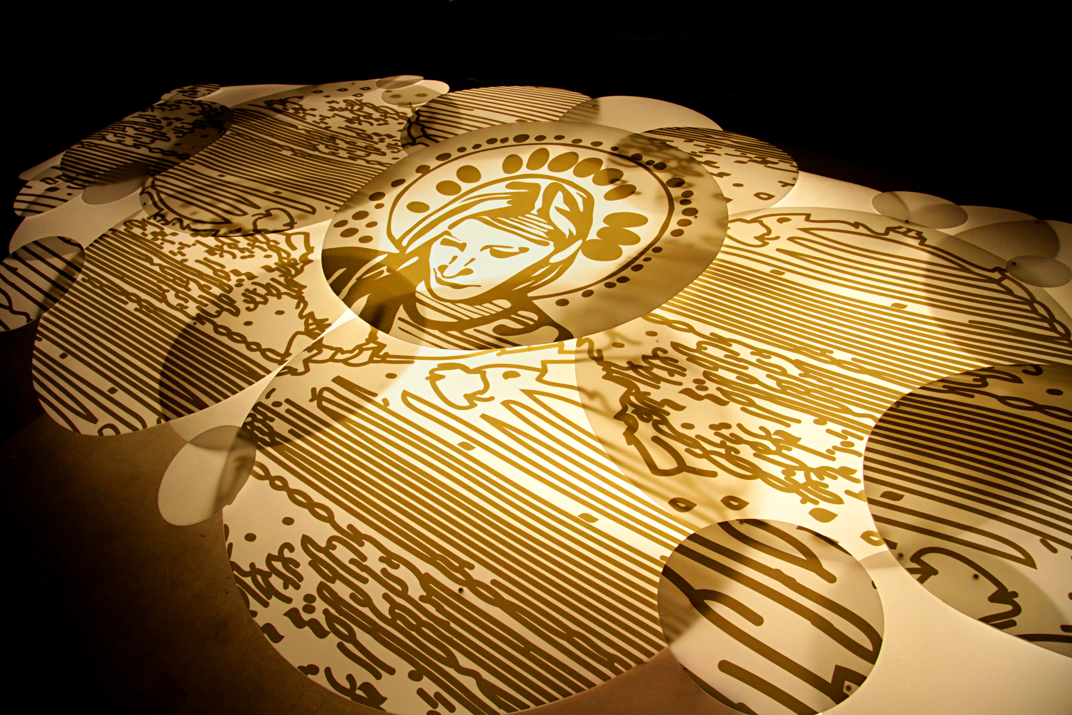 GOLDEN UROS explores the duality of ancient beliefs and universal spirituality by incorporating the imagery of Amorós’ golden self-portrait as a deity.
