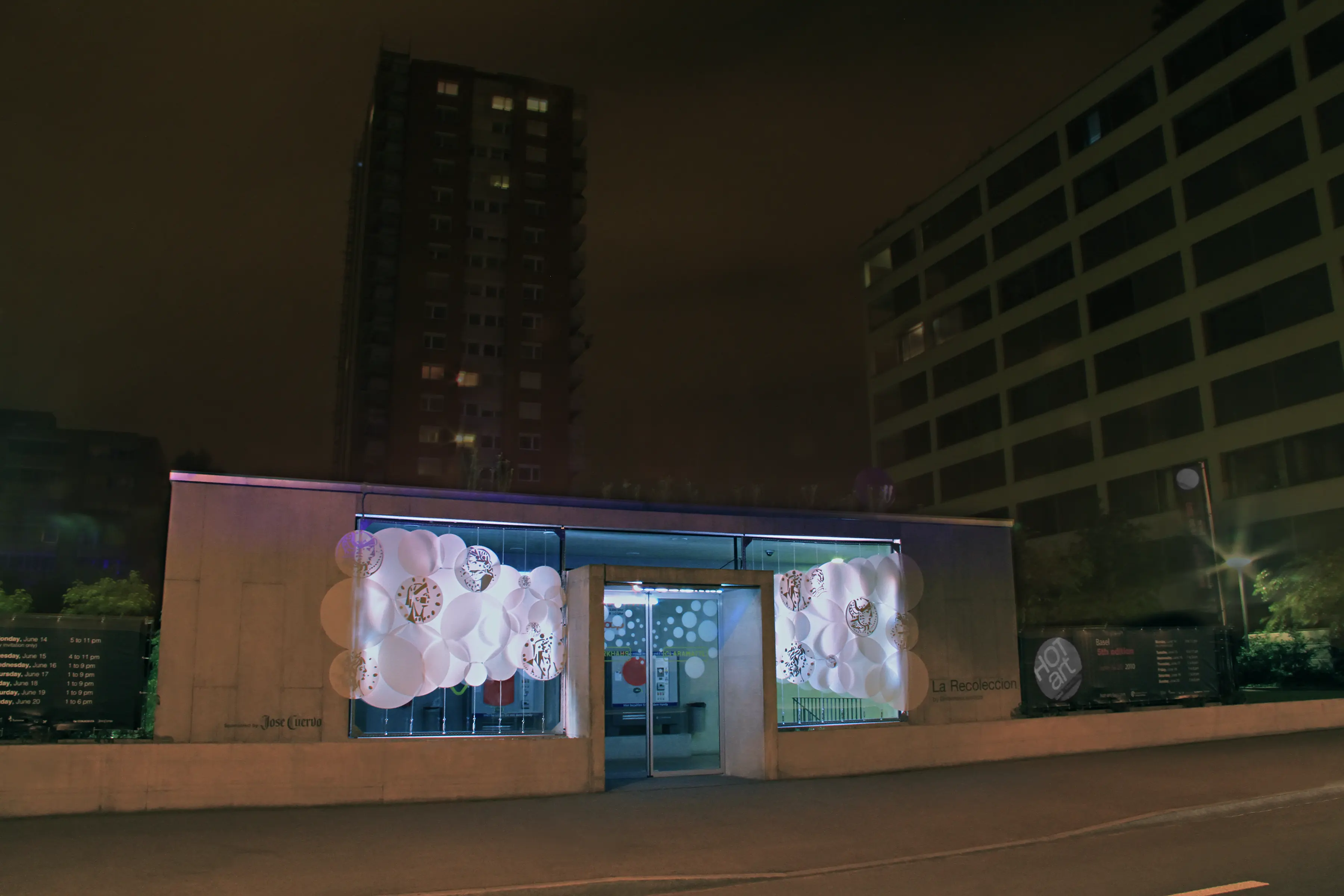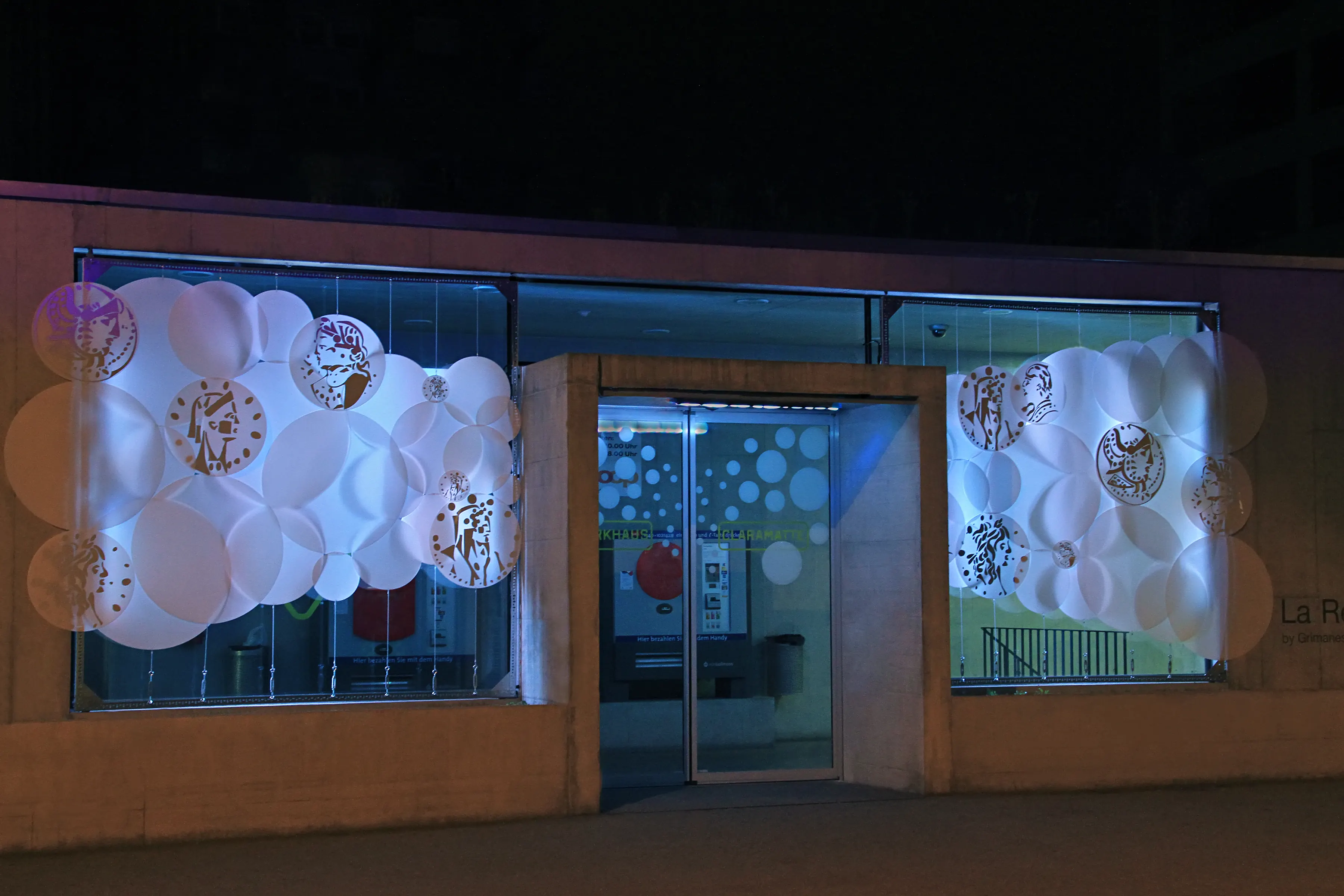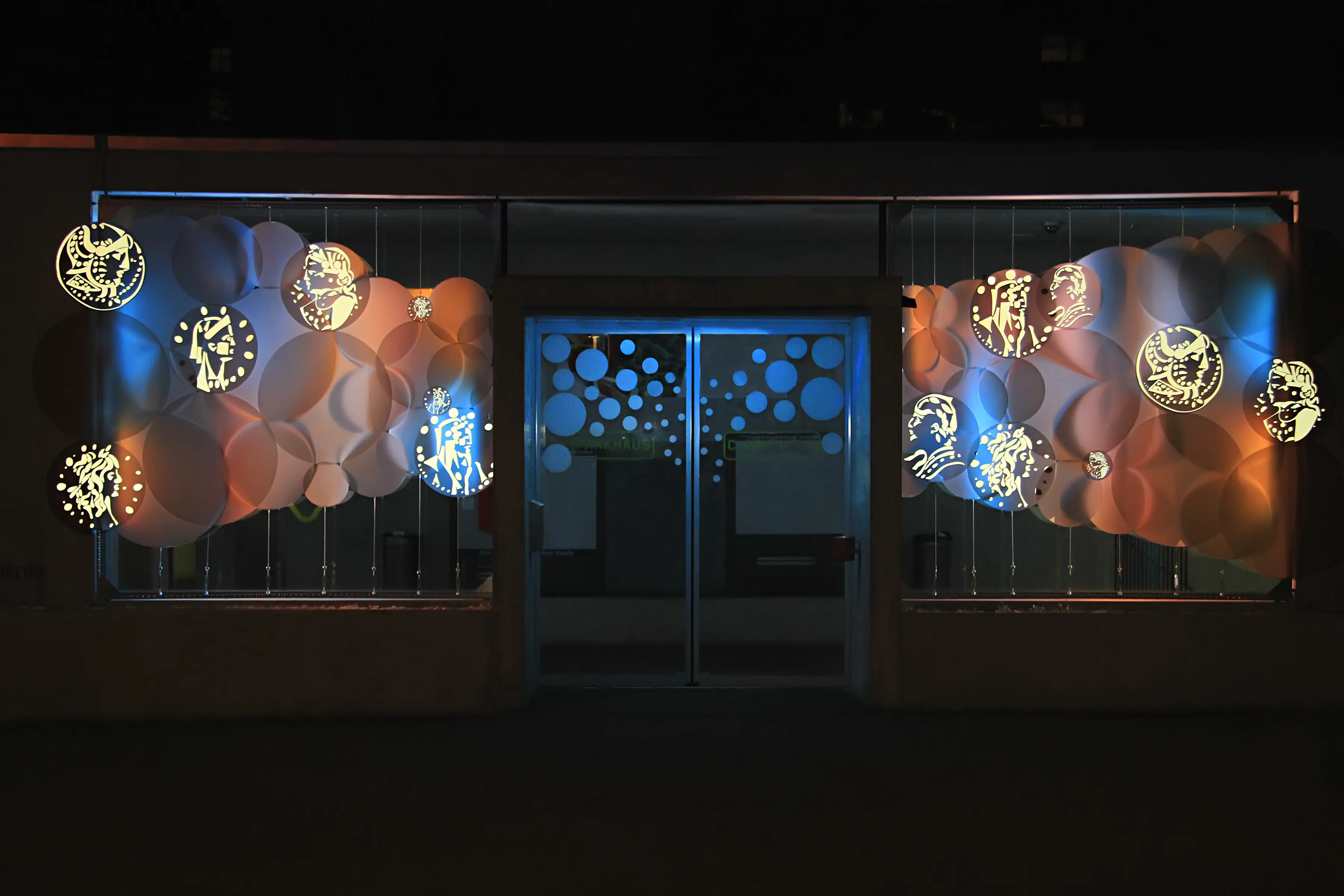 LA RECOLECCIÓN, by Grimanesa Amoros, ingeniously transforms a facade in Basel into a mystical, reimagined vending realm. The entry or exit into this space is marked by coins, artfully designed by Amoros, offering a symbolic gesture. These coins, rich in symbolism, embody not just wealth and luck but also the journey from one point to another. Amoros meticulously crafts her drawings on round polycarbonate circles, each representing her unique interpretation of currency, skillfully integrating distinguishing elements from Swiss Francs and Mexican Pesos.