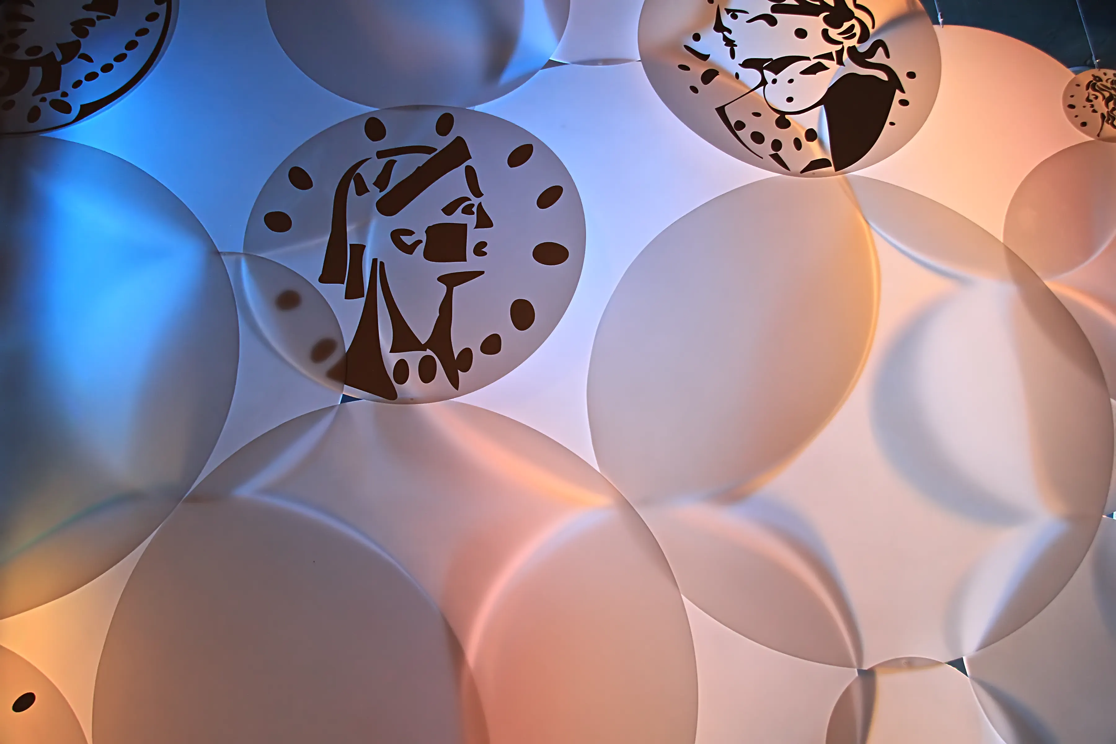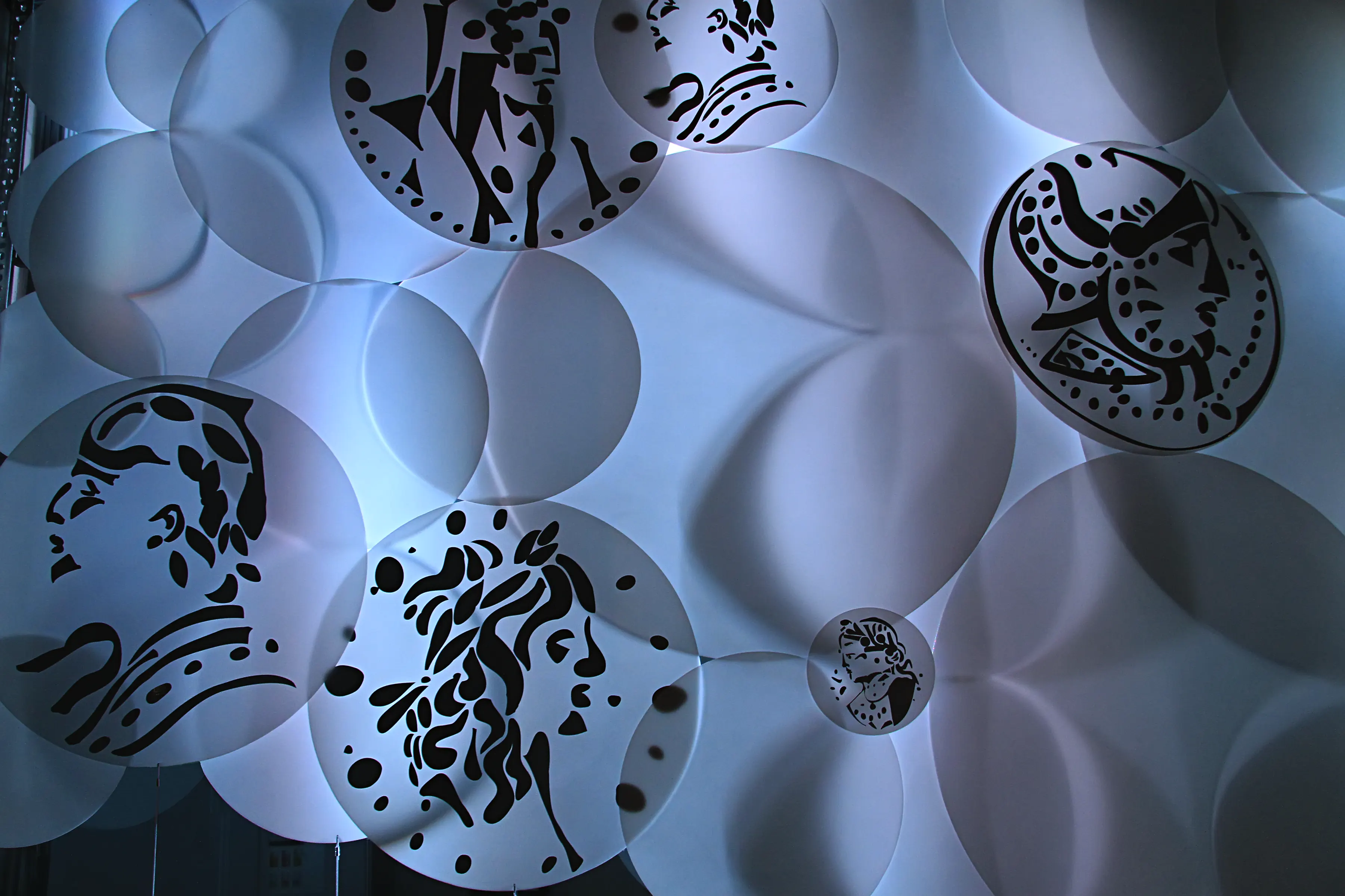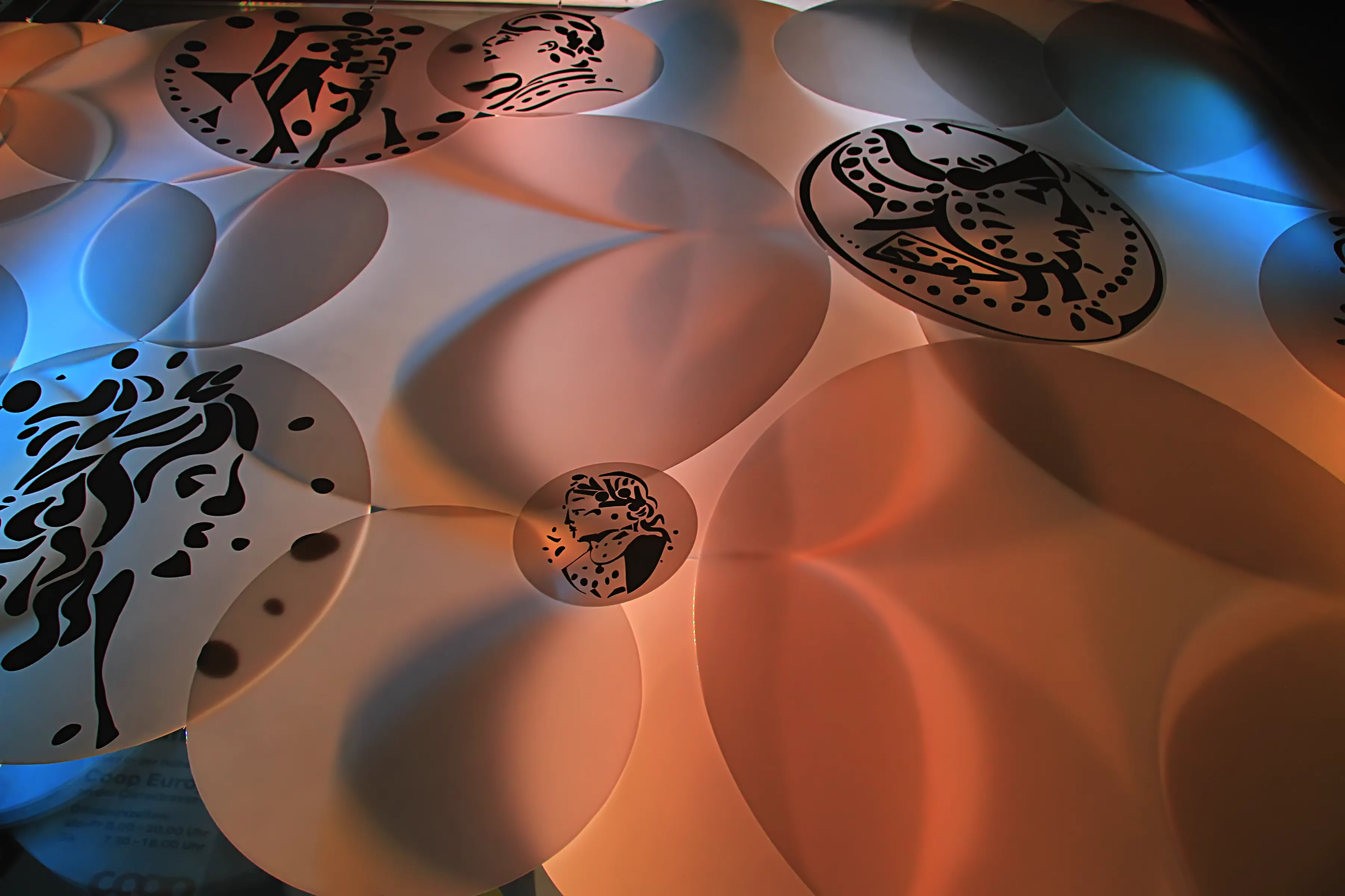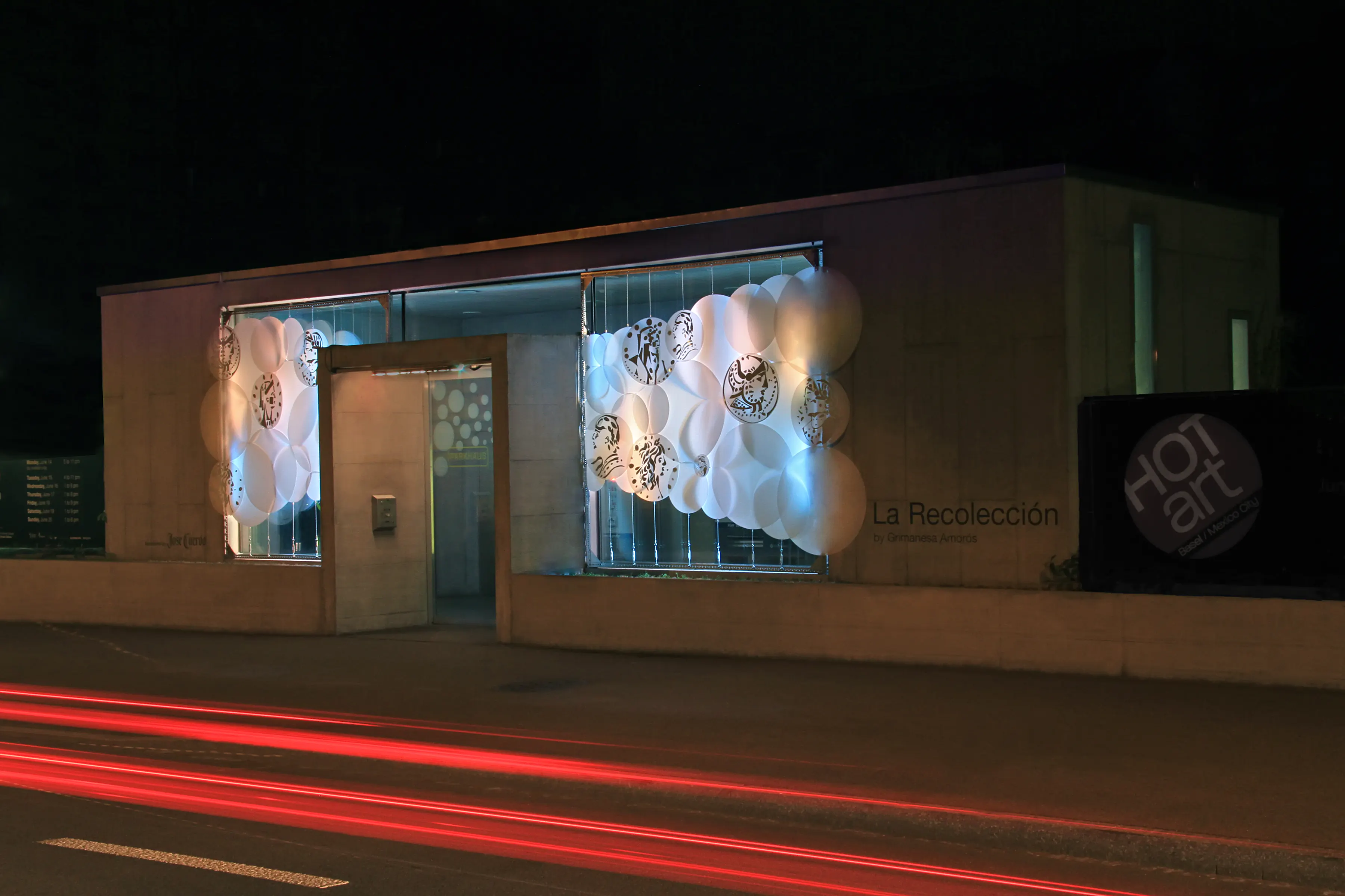 LA RECOLECCIÓN, by Grimanesa Amoros, ingeniously transforms a facade in Basel into a mystical, reimagined vending realm. The entry or exit into this space is marked by coins, artfully designed by Amoros, offering a symbolic gesture. These coins, rich in symbolism, embody not just wealth and luck but also the journey from one point to another. Amoros meticulously crafts her drawings on round polycarbonate circles, each representing her unique interpretation of currency, skillfully integrating distinguishing elements from Swiss Francs and Mexican Pesos.
