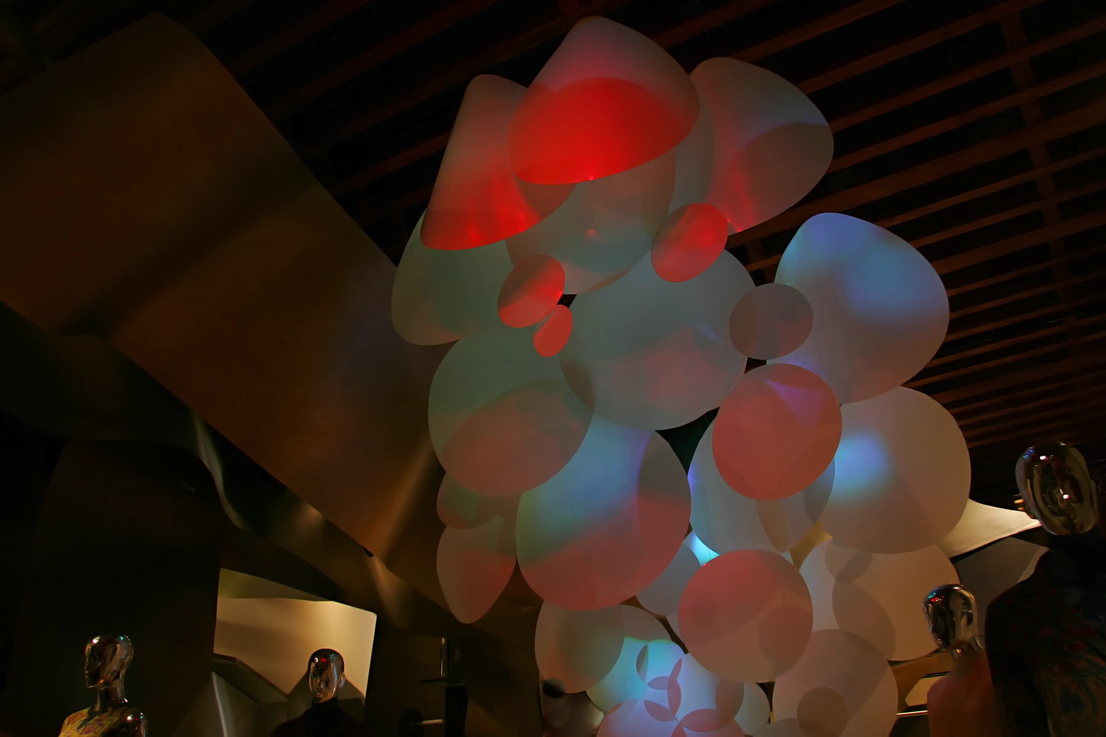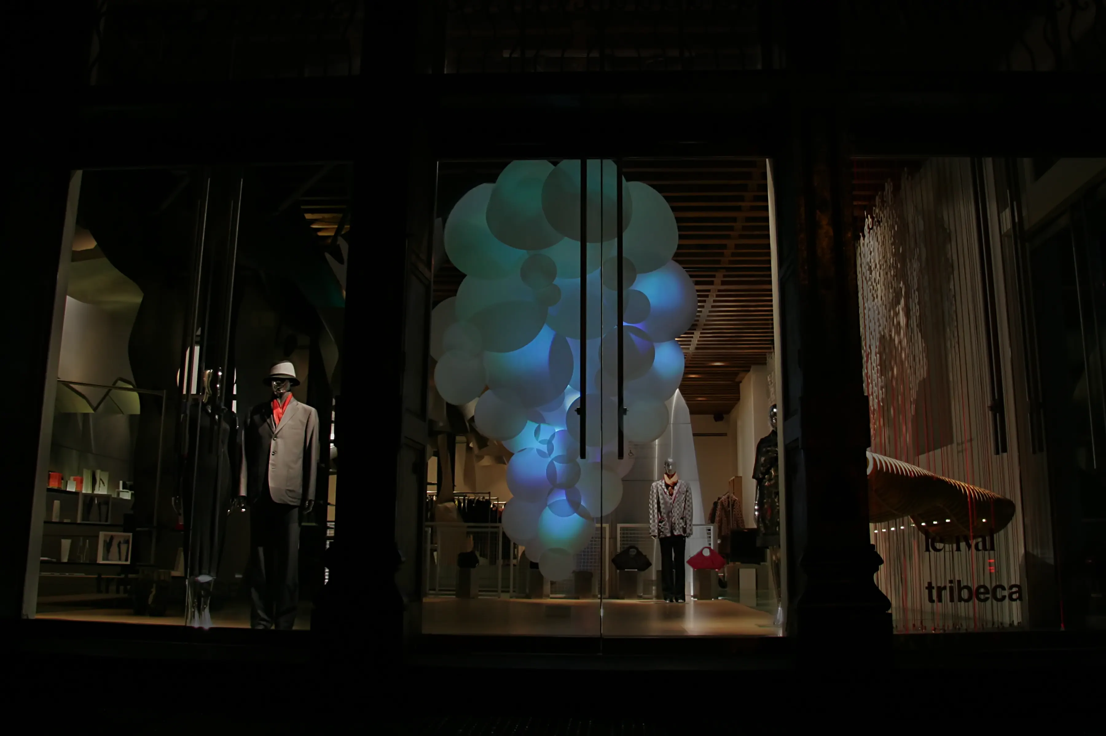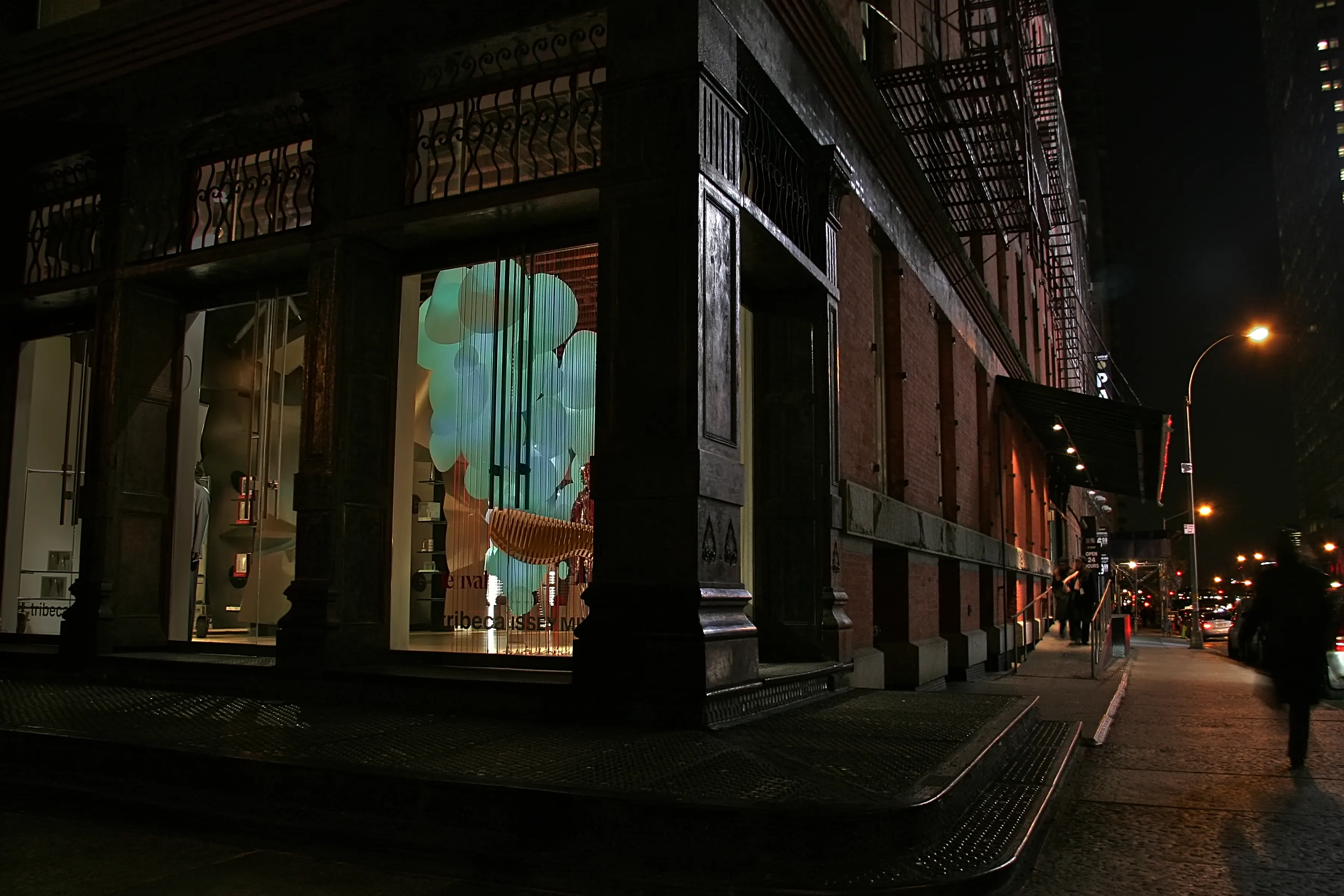Inspired by the Northern Lights, Grimanesa Amorós takes the viewer on a journey in her work AURORA. This light sculpture was created for the window of Issey Miyake’s headquarters in TriBeCa. The installation was inspired by how the aurora borealis draws itself across the night sky in sweeping strips of shifting color and movement. Its form suggests light unfolding like the stars in the sky, echoing the natural arcs that illuminate the polar horizon.