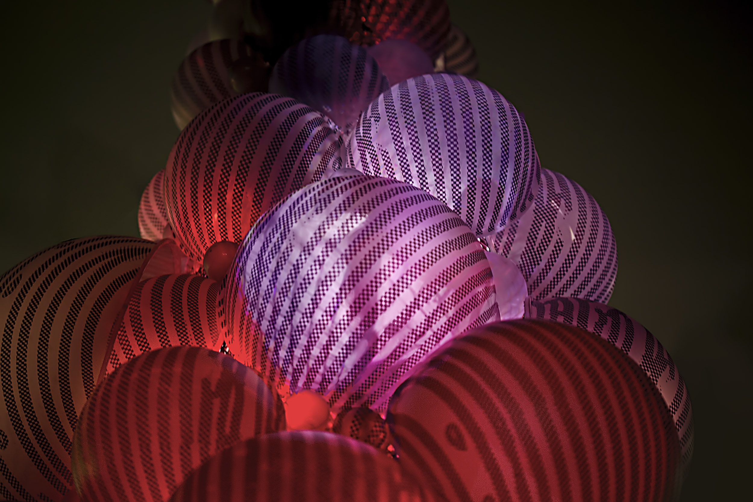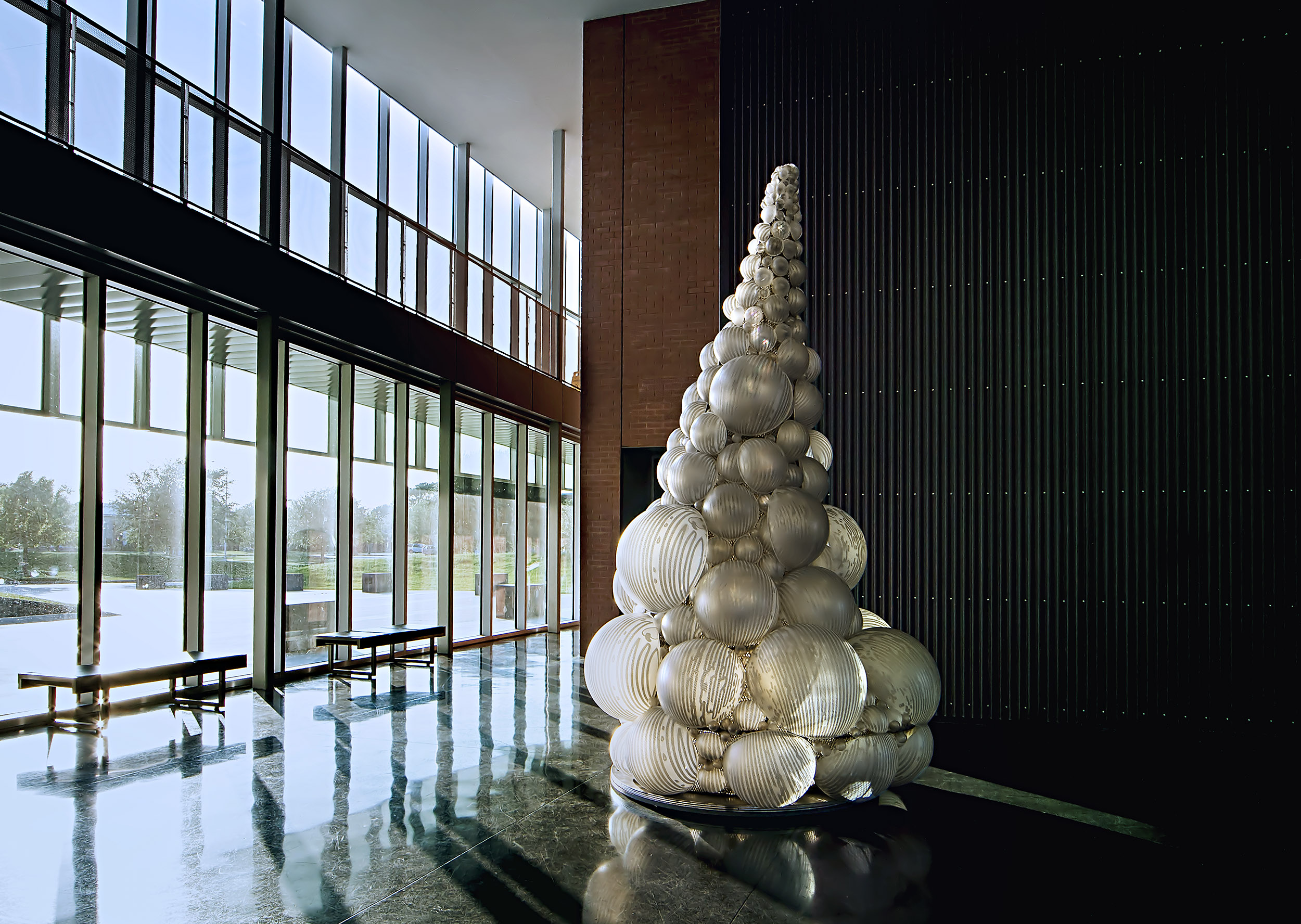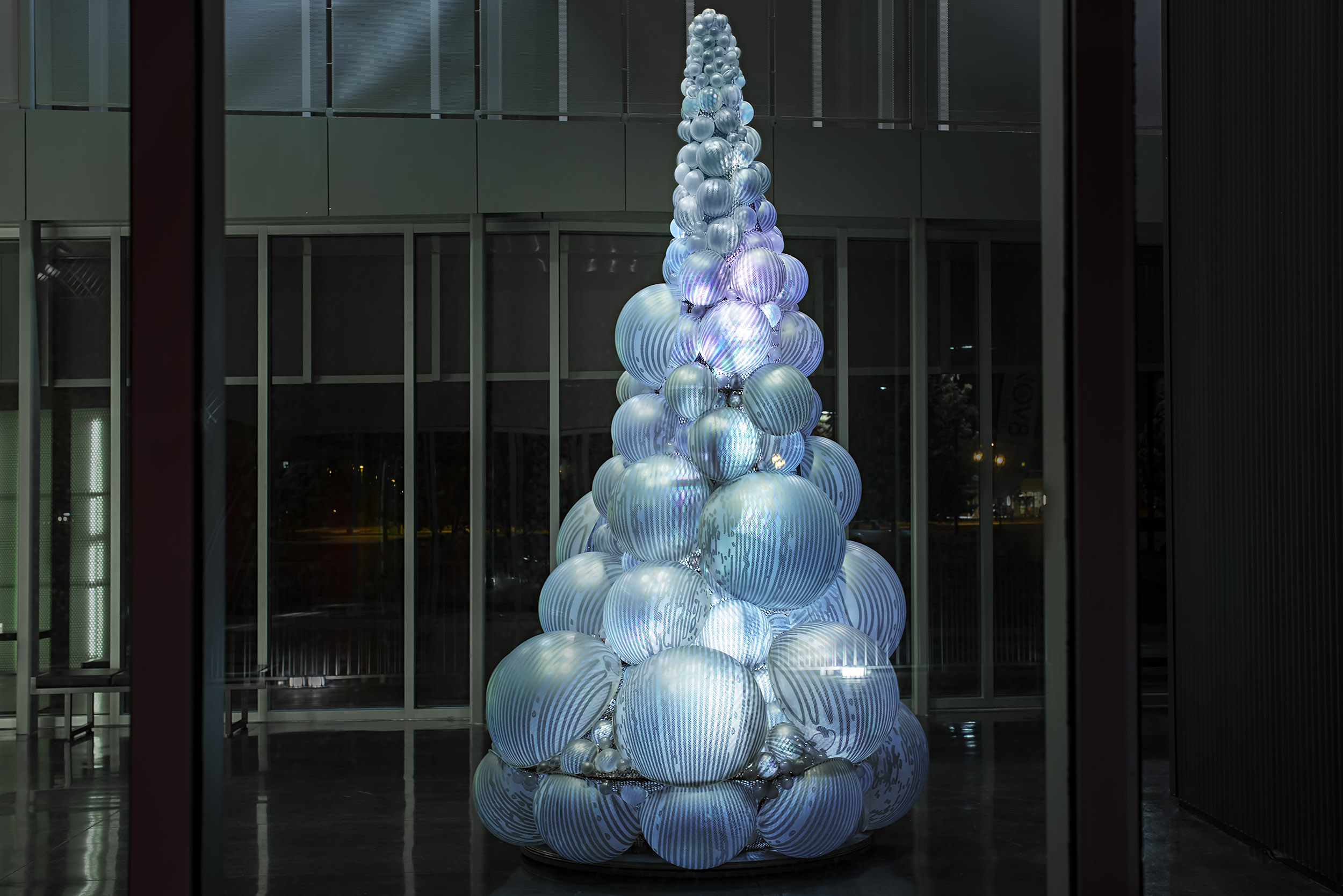 Media: Stainless steel, diffusion material domes, silkscreen, aluminum, custom lighting sequence, and electrical hardware
