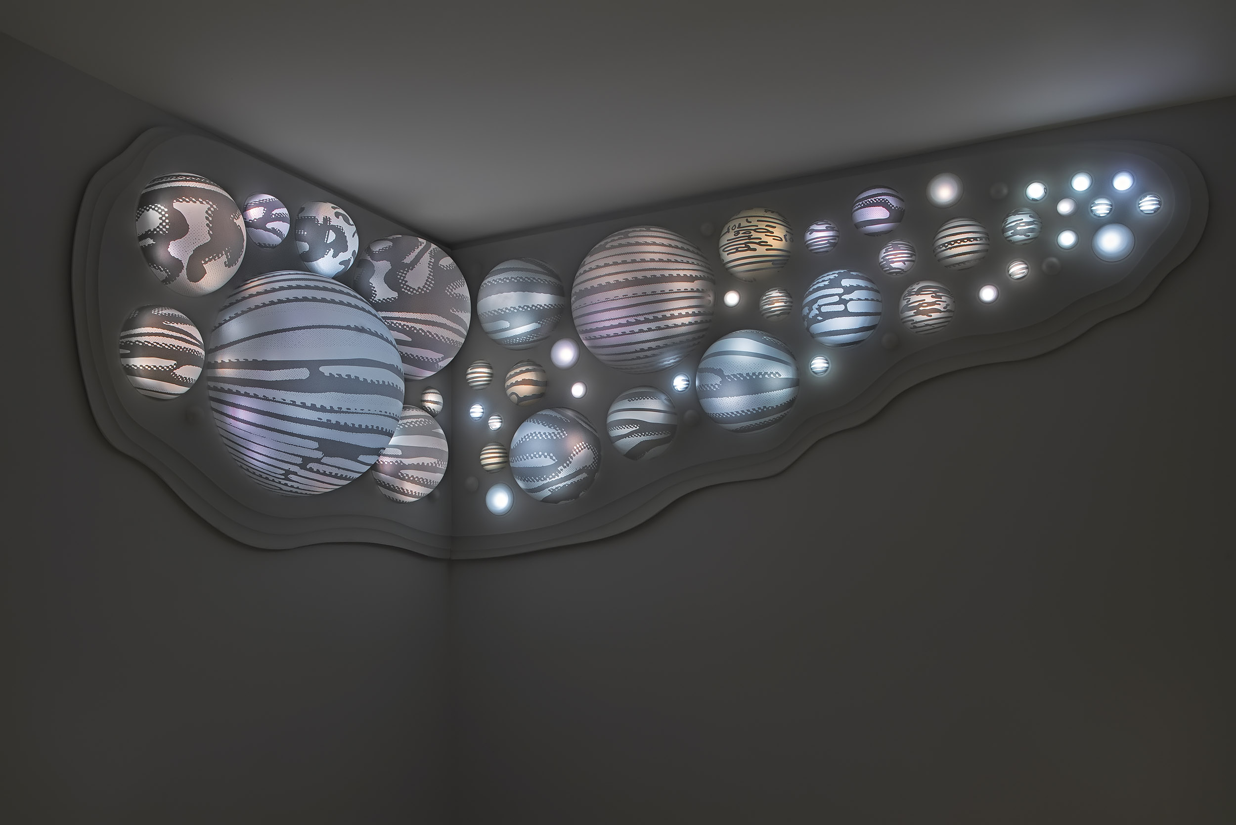 Media: Stainless steel, diffusion material and reflective material, LEDs, custom lighting sequence, and electrical hardware