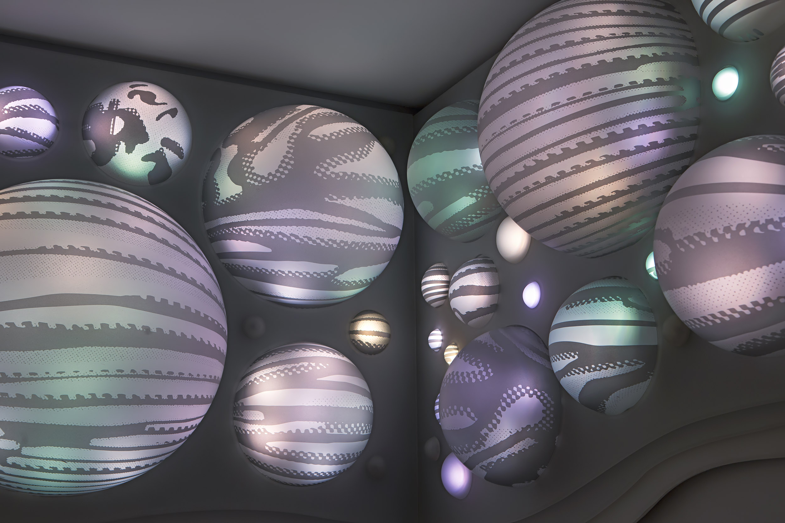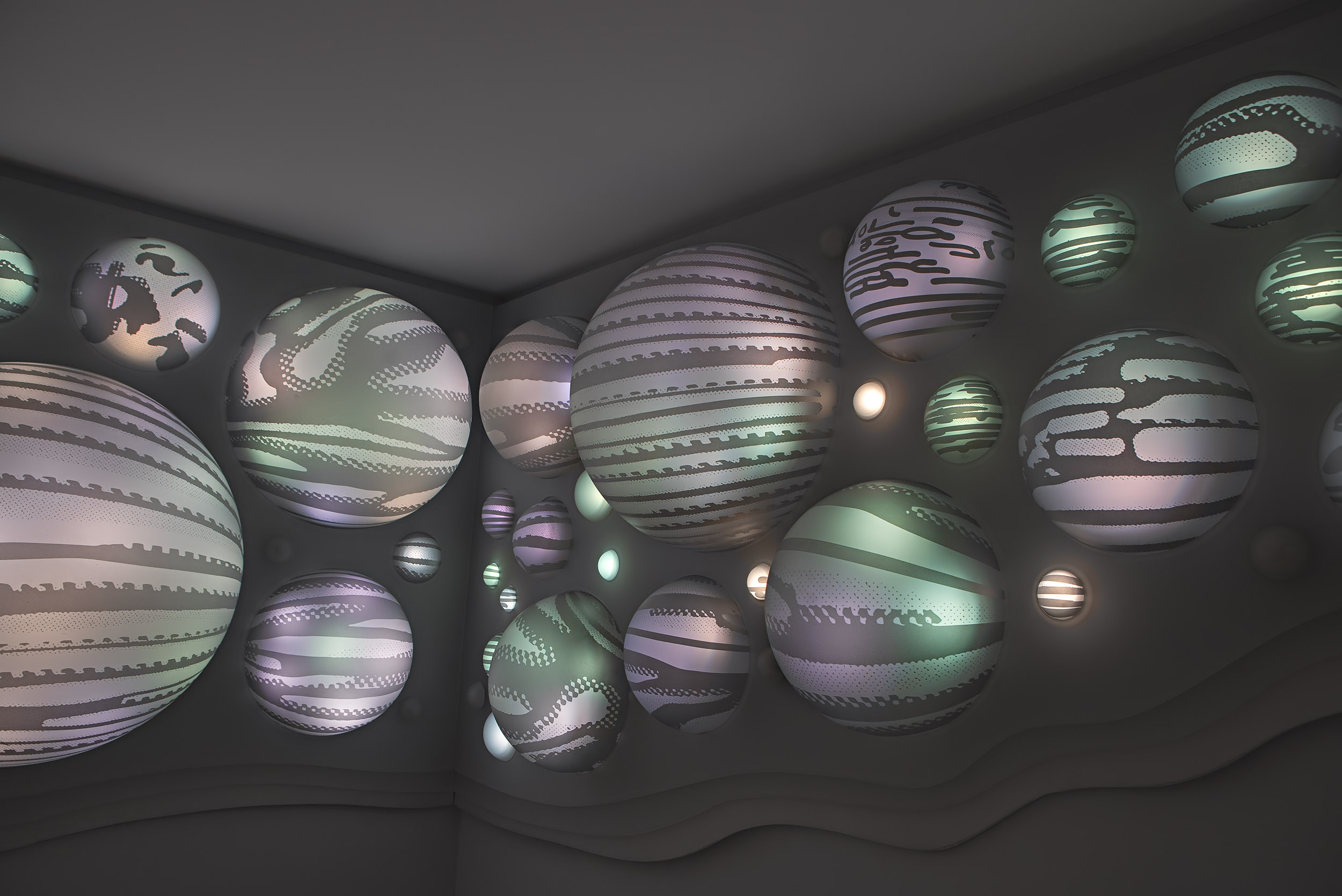 The silkscreens in IUGO were inspired by a profound moment during Amoros’s plane descent into Tel Aviv. Captivated by her surroundings, she peered out the window to witness breathtaking vistas of vineyards, citrus groves, and olive fields sprawled across the landscape. The mesmerizing arrangement of these diverse crops eventually led to the development of the final print in IUGO’s cupolas.