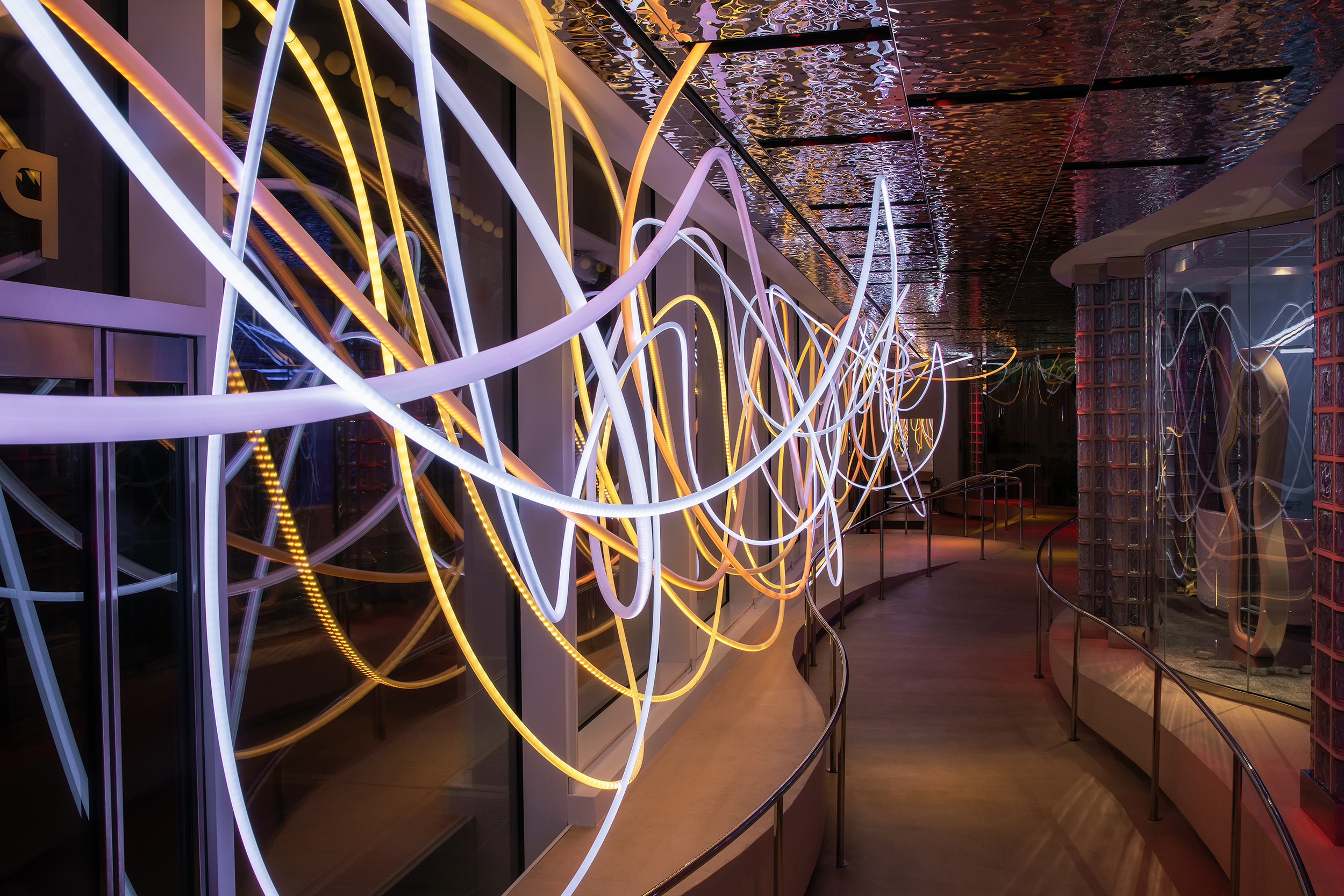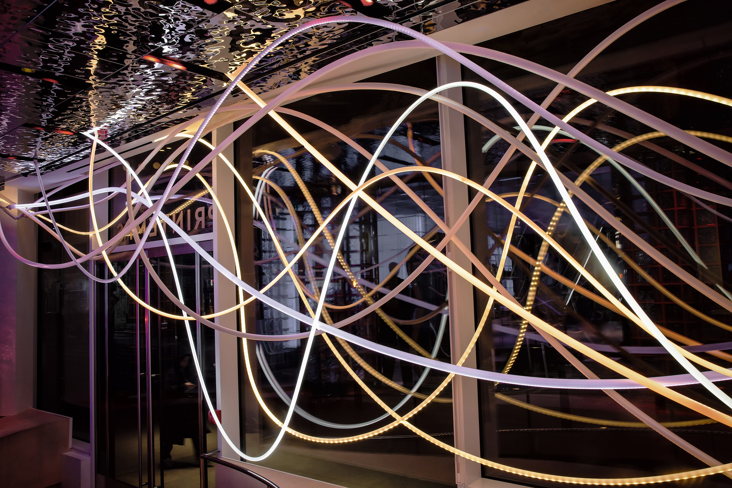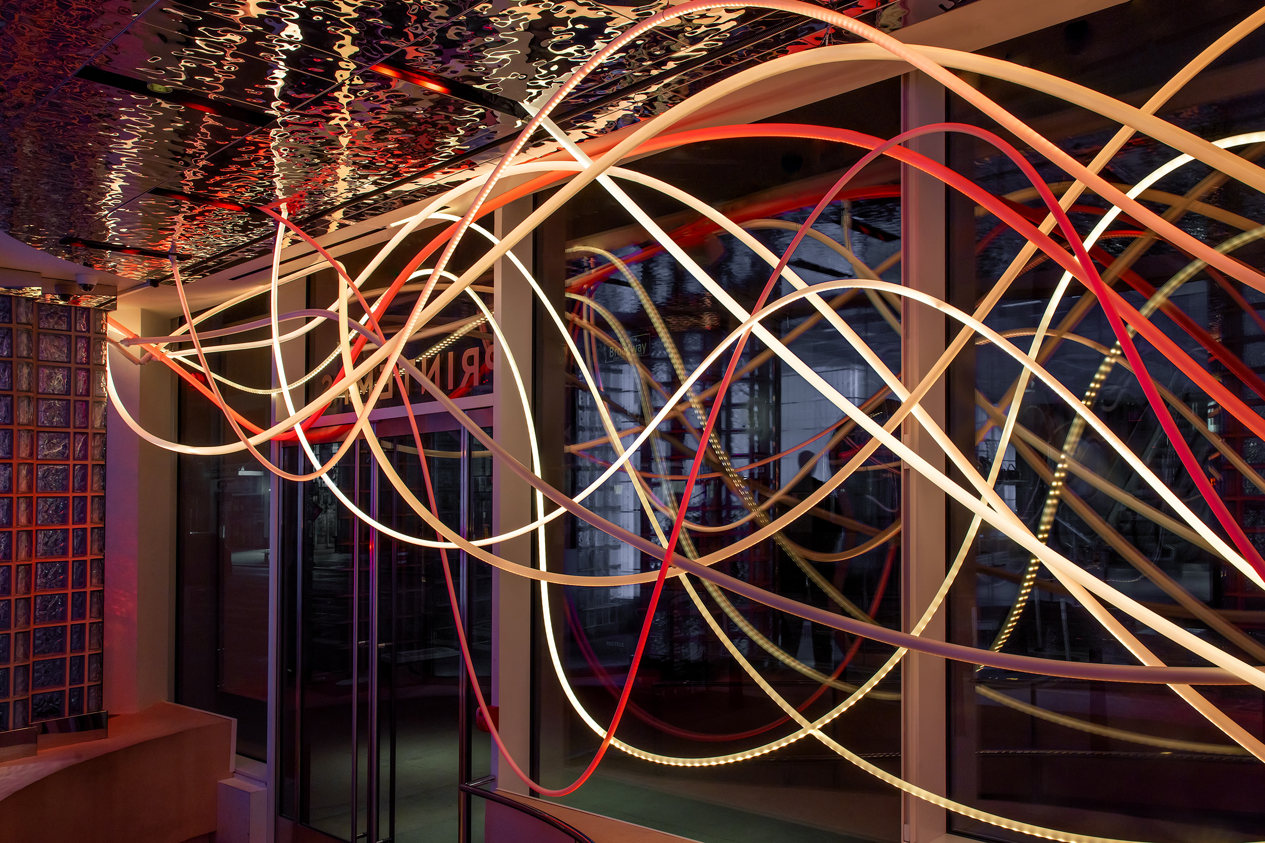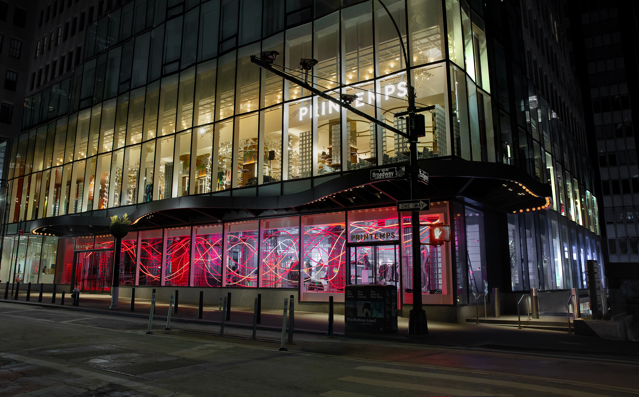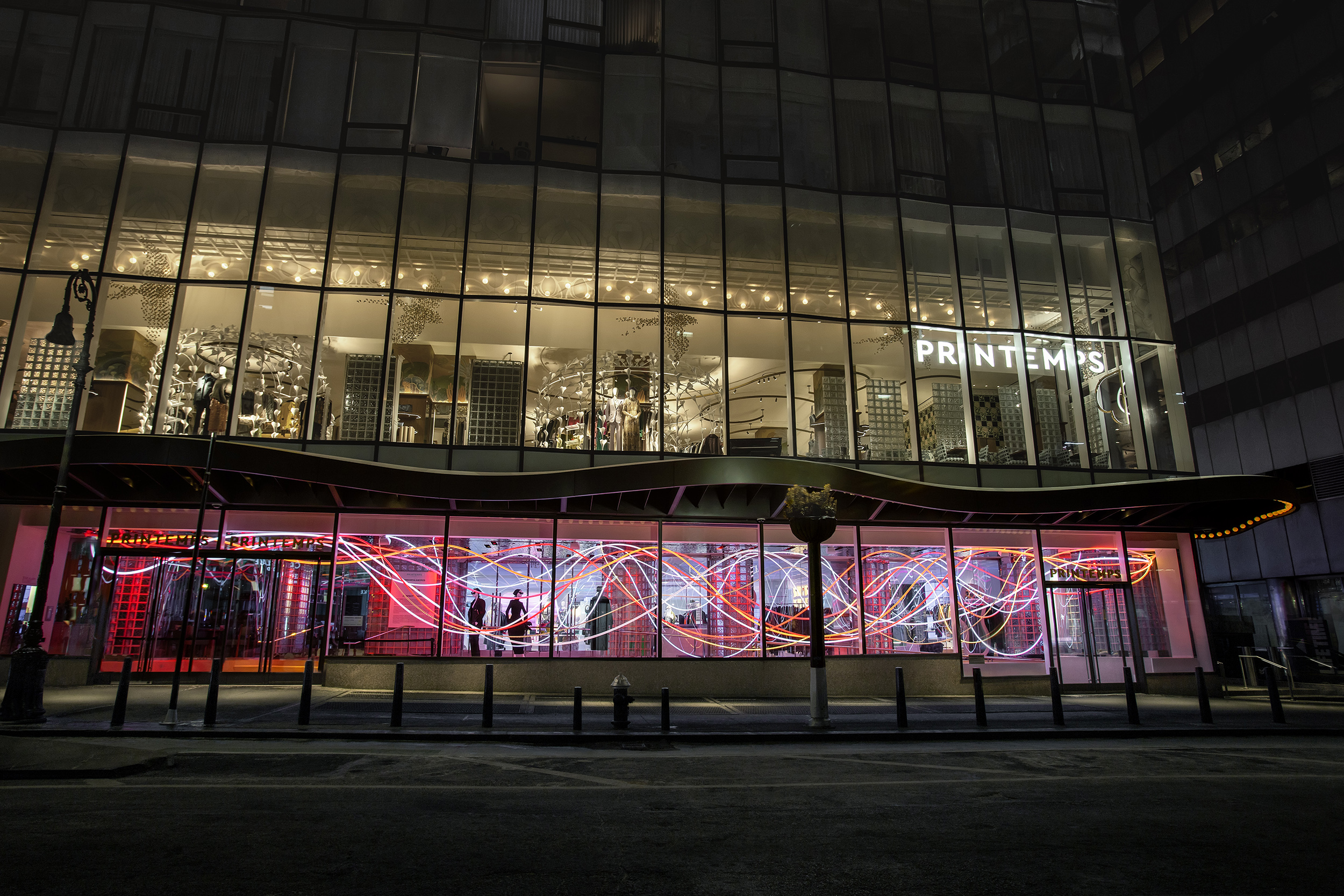 This artwork universally transforms light and time into signals of language. The lights are a measure of time itself, a dance of pause and motion. Clients may be seen waiting with the signature Printemps bag, hailing a yellow cab, or stopping at a red light, which is a vivid cycle of color that mirrors New York’s vibrant atmosphere.
