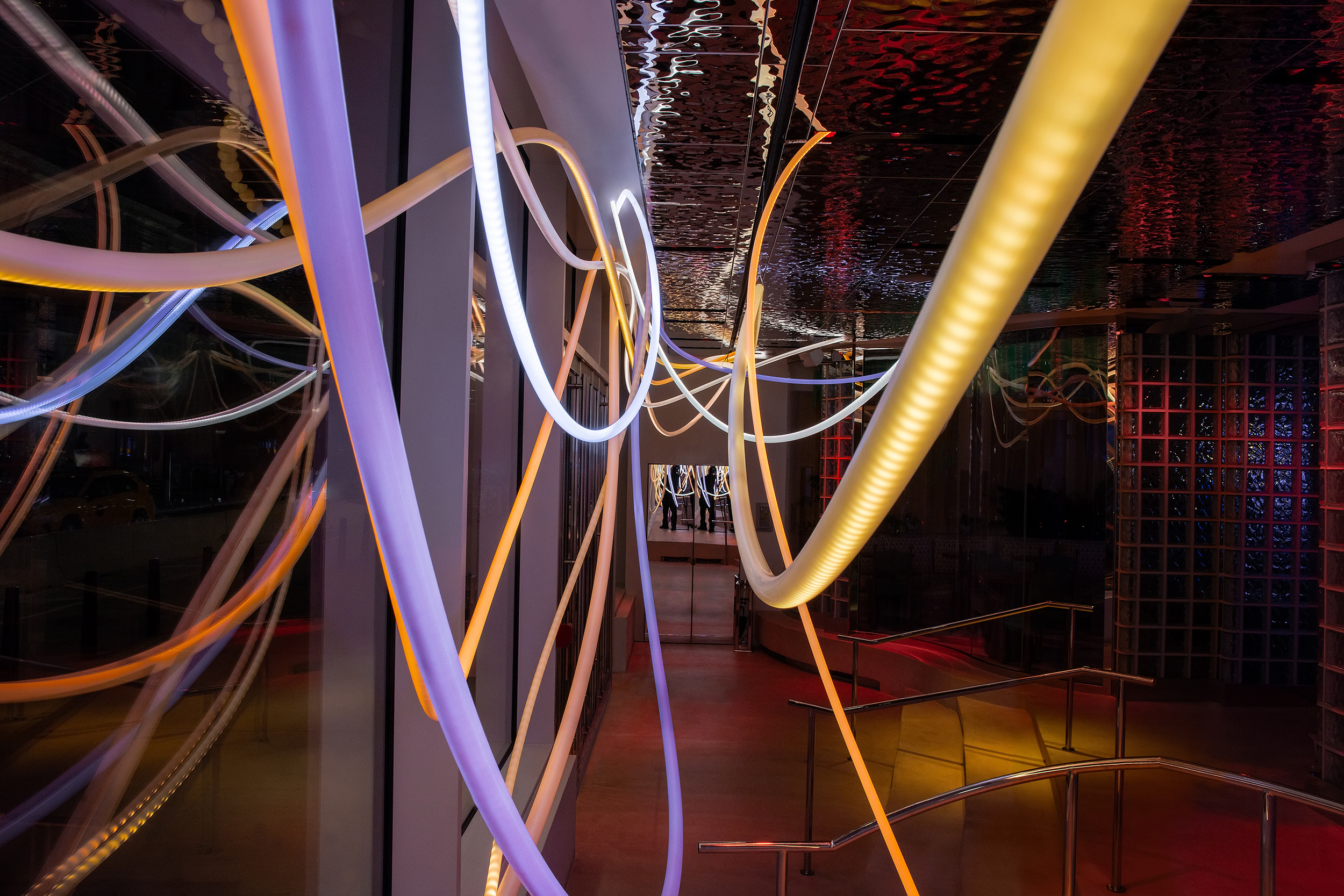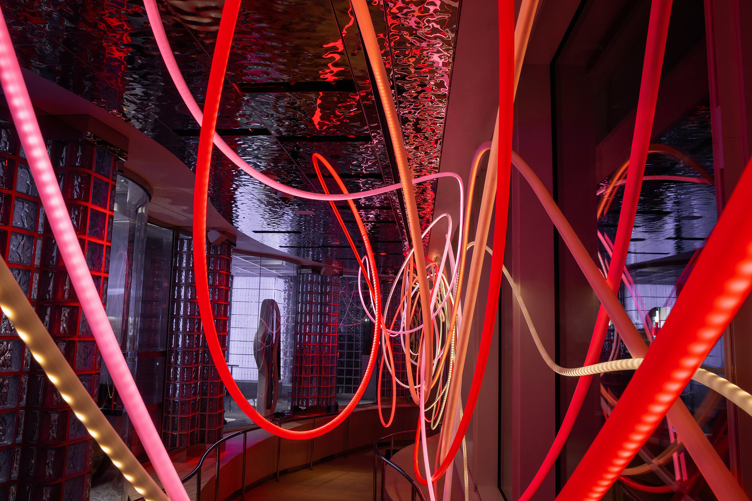 This installation upholds Amorós’s ethos of composing light like music, shaping each sequence “note by note,” in her New York studio. The installation responds to the building’s architectural lines and Printemps Parisian heritage, bringing together history and urban energy. Cities, like Paris and New York, are defined by their cadence. In New York, green accelerates, yellow questions, and red becomes a suggestion. The streets pulse with honking horns and hurried footsteps, forming a choreography that captures the essence of “The City.” Within this dance lies New York’s actual heartbeat, a perpetual negotiation between stillness and speed.