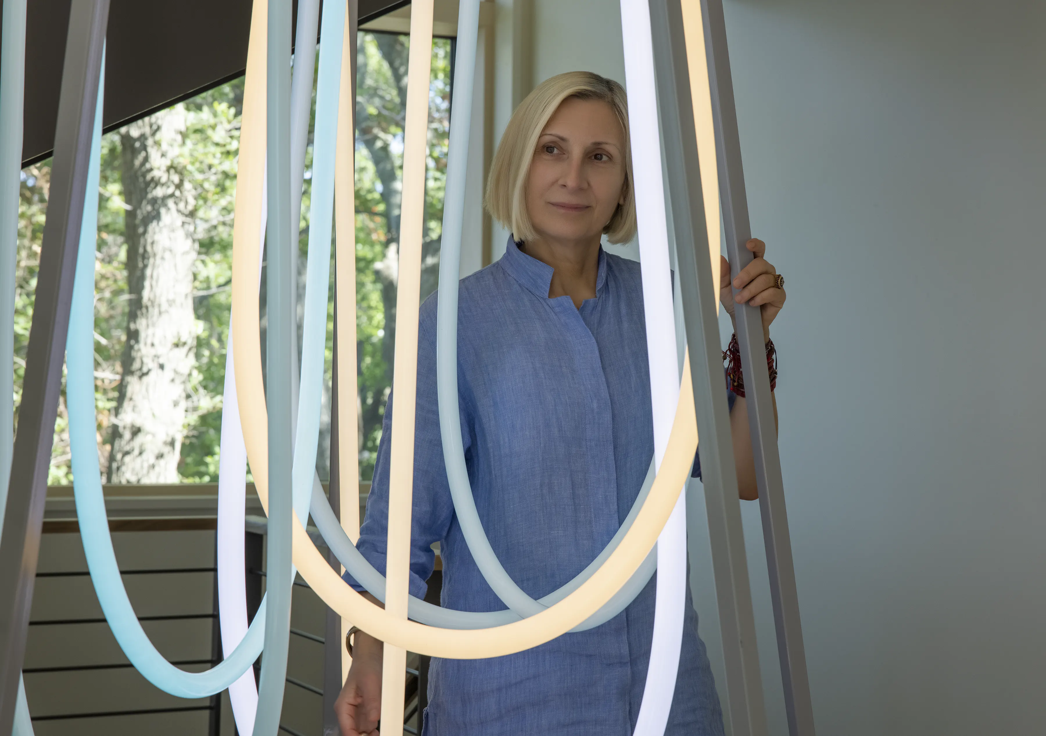 AETERNUM is a 16-foot light sculpture created for a private residence on Shelter Island, its luminous form tracing the Incan lunisolar calendar’s eternal dance between sun and moon in a work conceived as both a personal tribute to two collectors who see themselves as twin flames and a meditation on time, change, and everlasting existence.