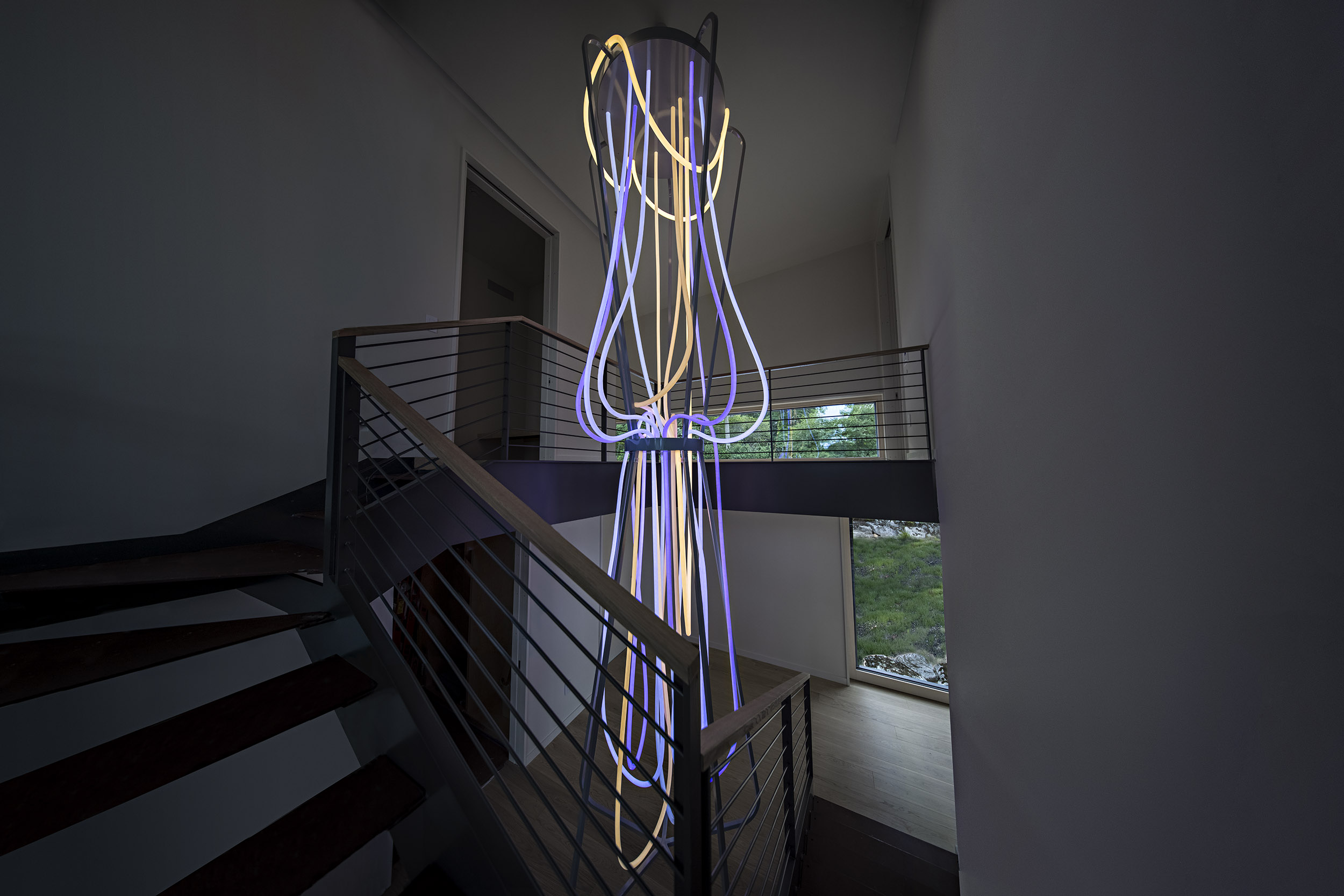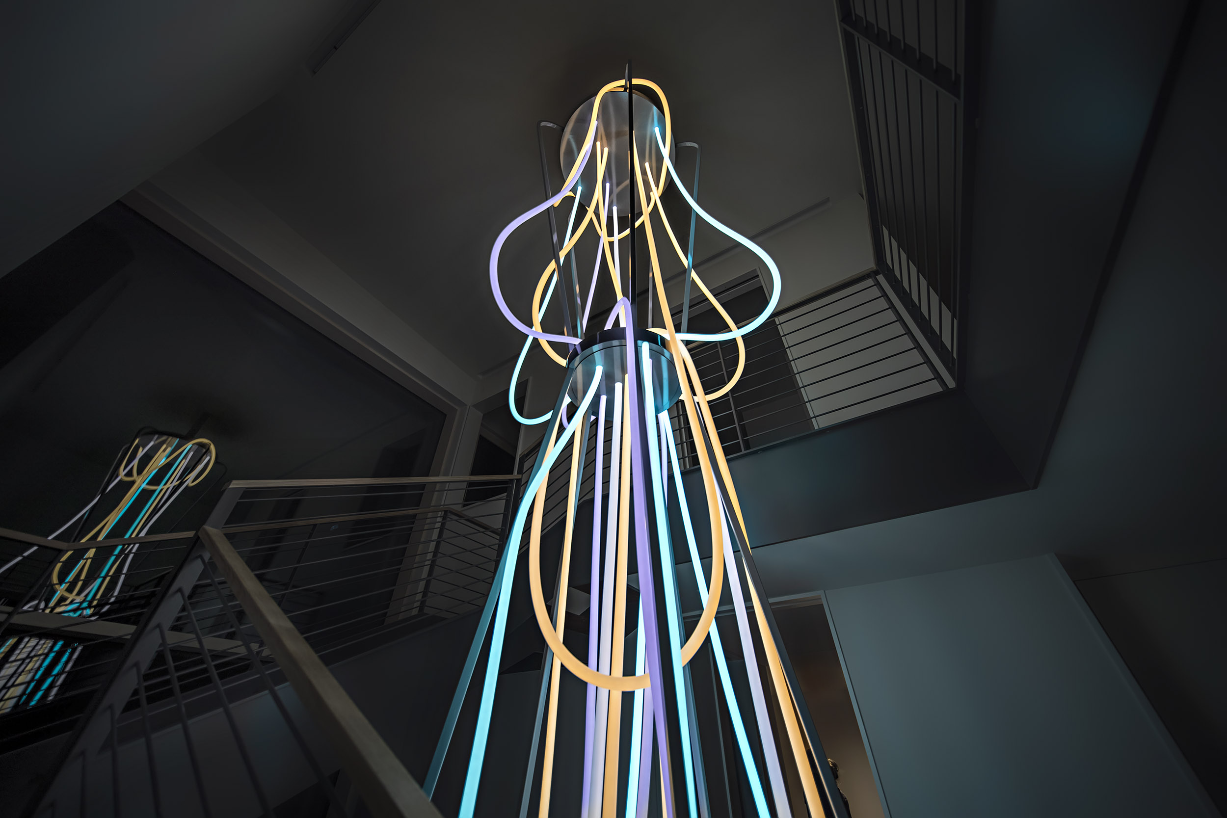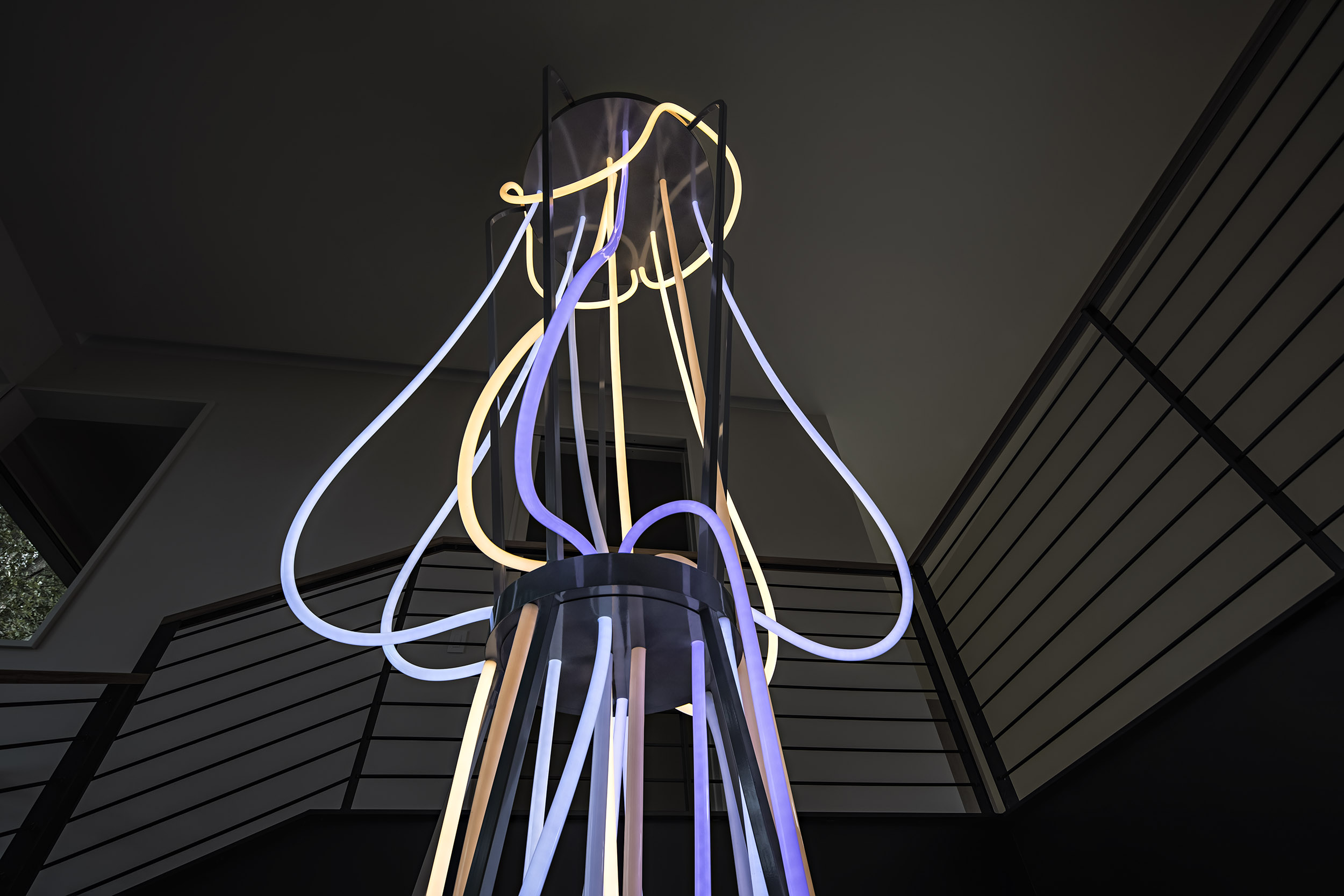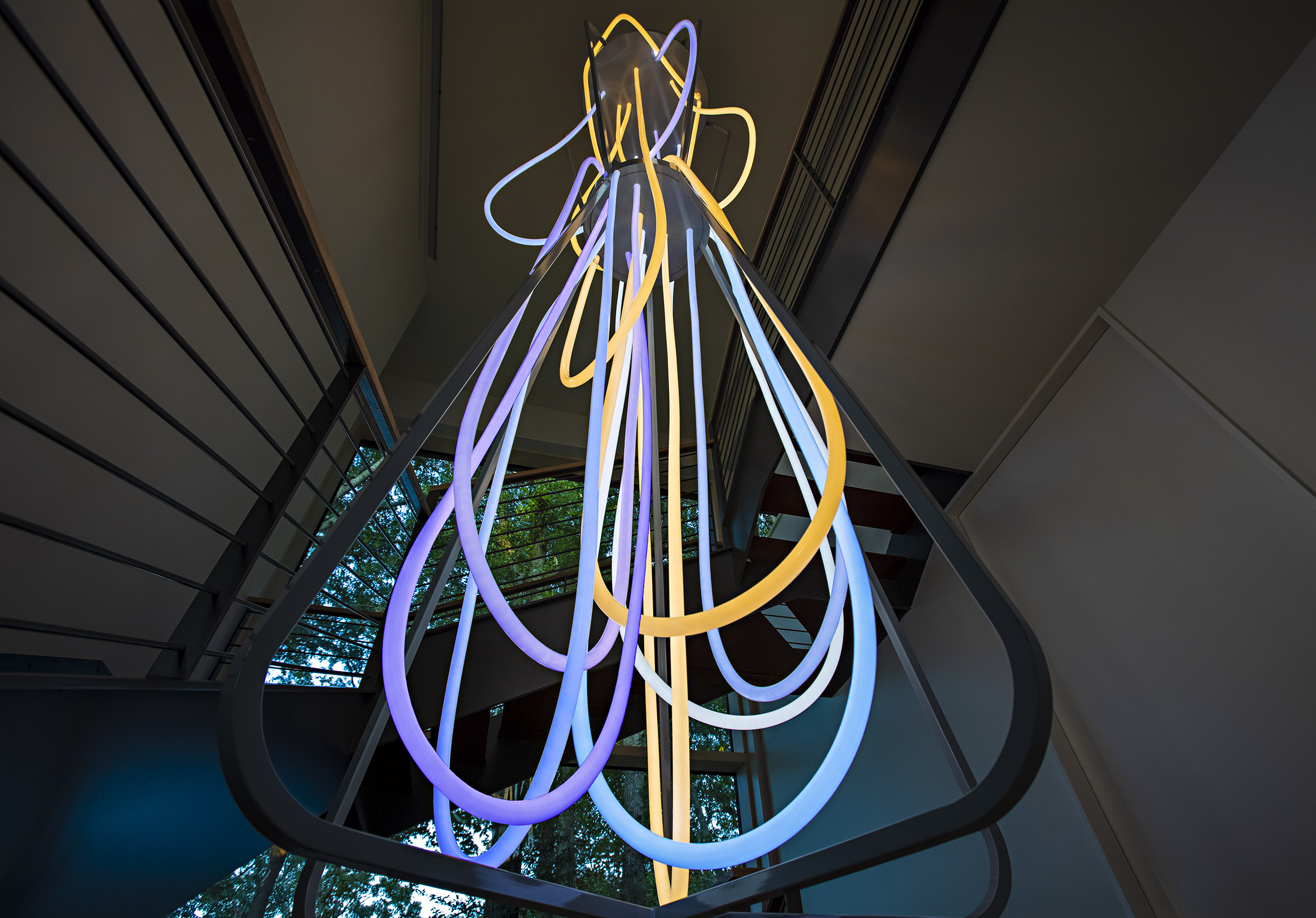 Media: Stainless steel, diffusion material and reflective material, LEDs, custom lighting sequence, and electrical hardware