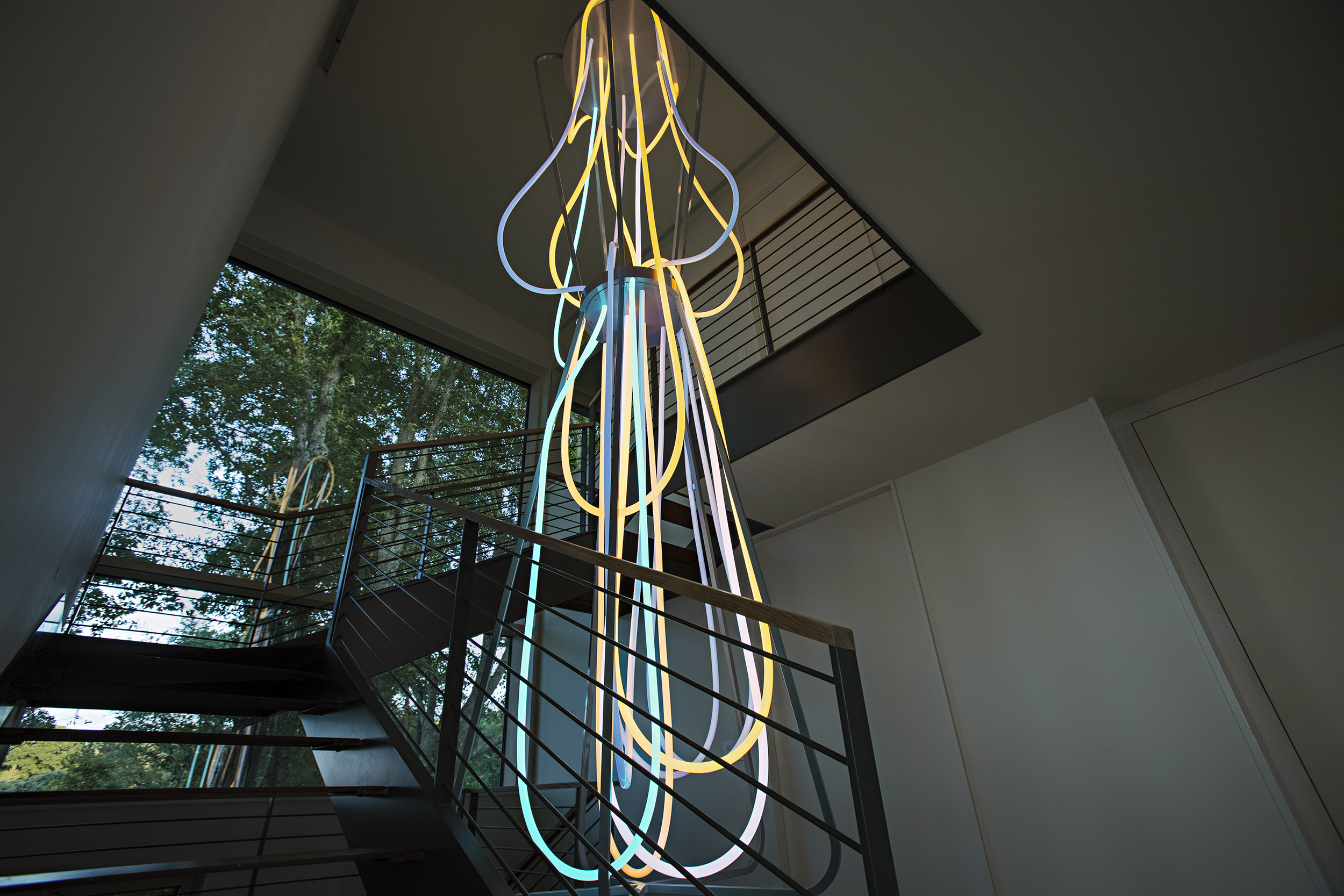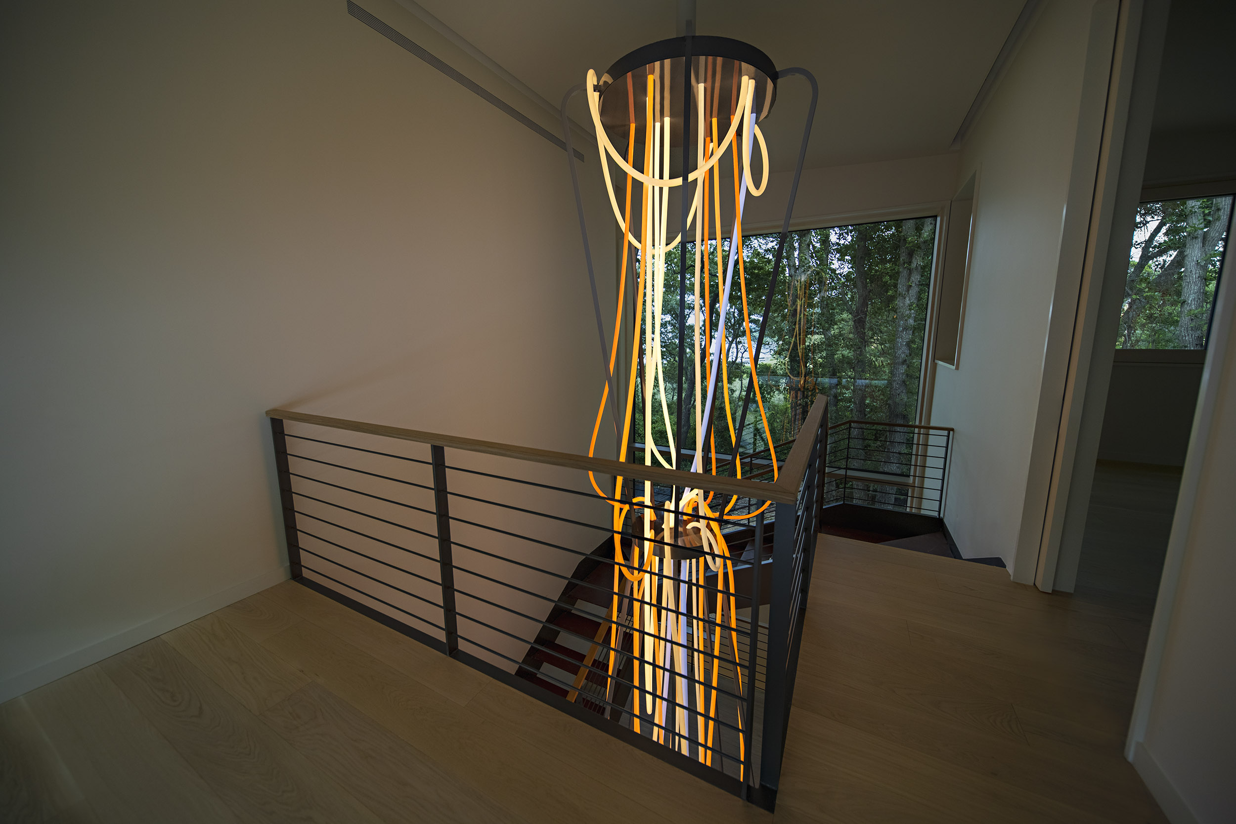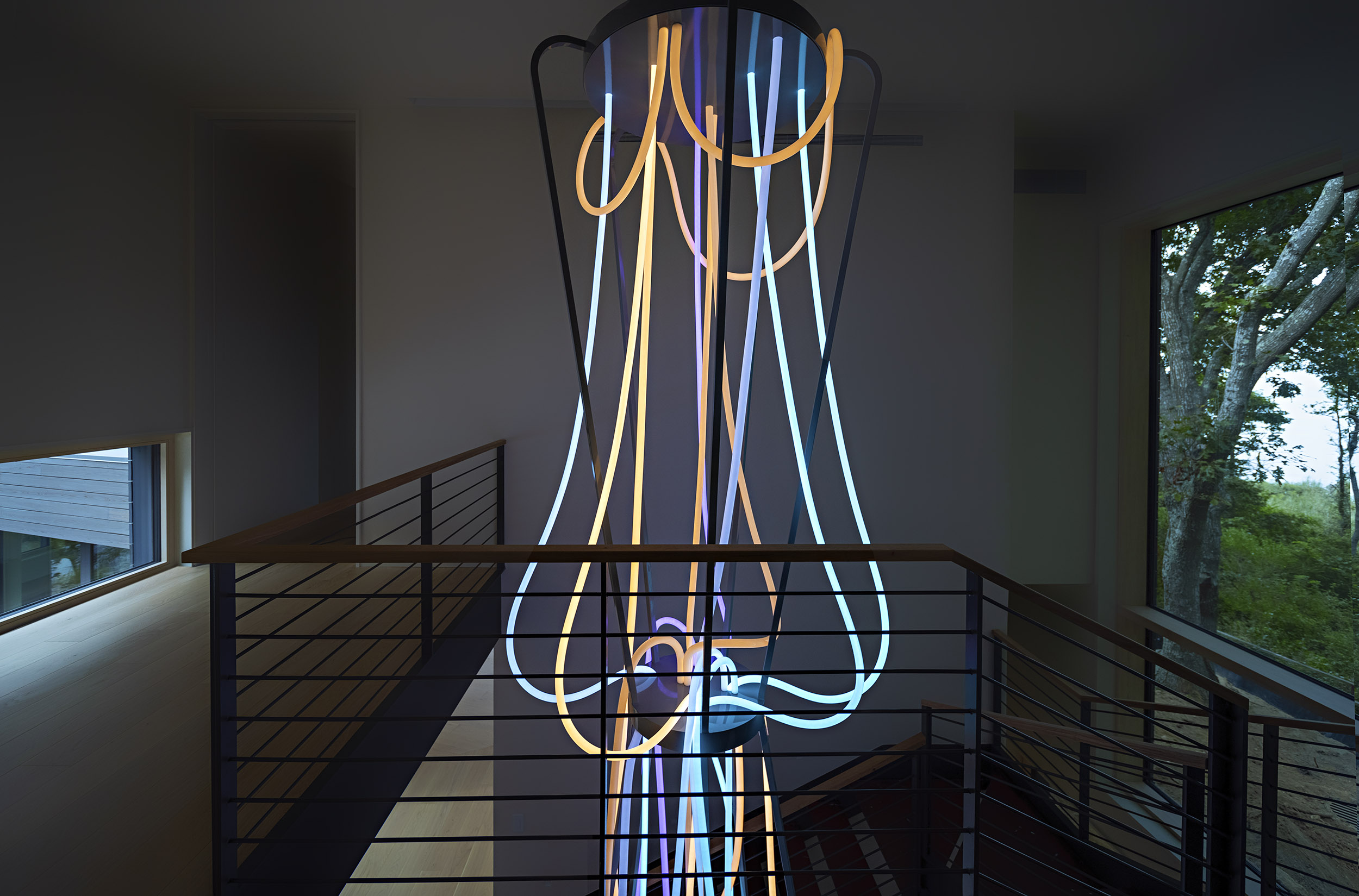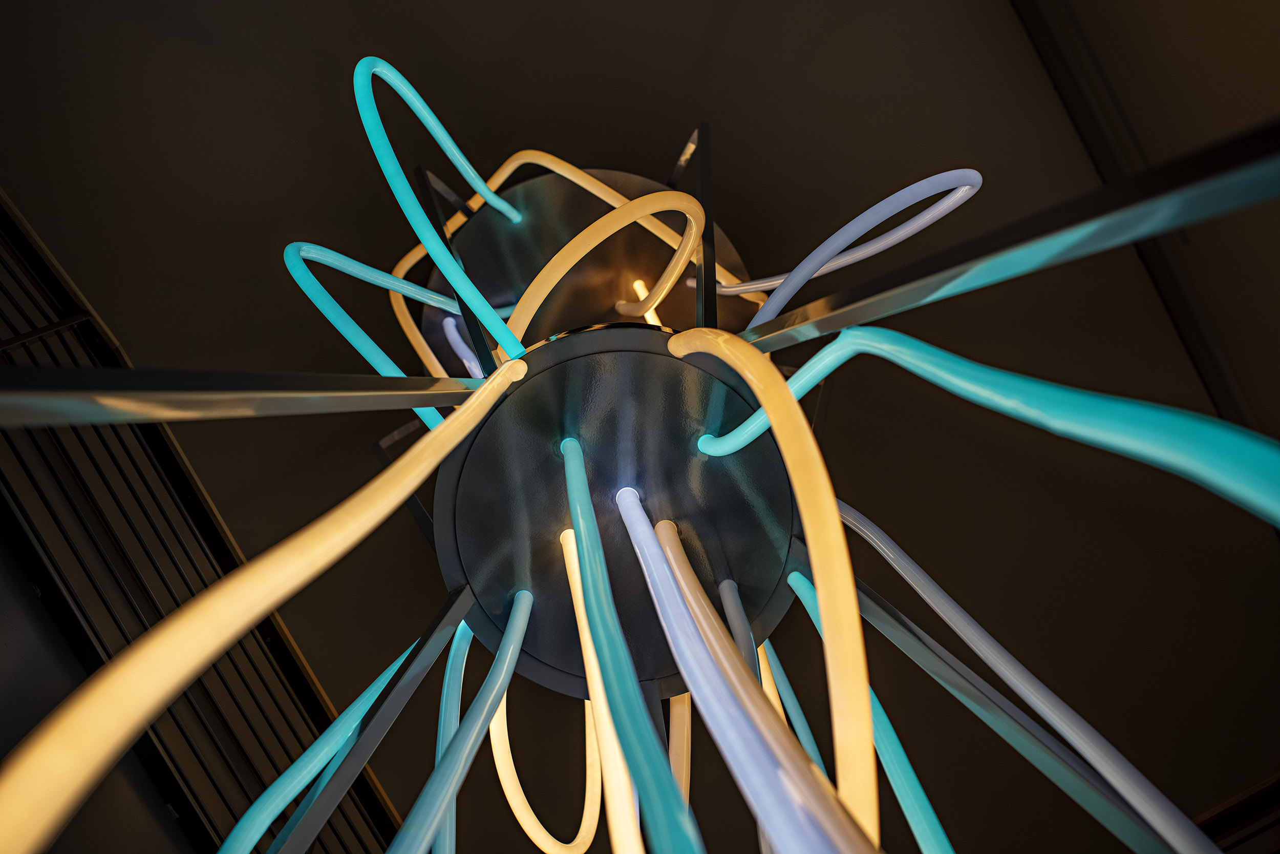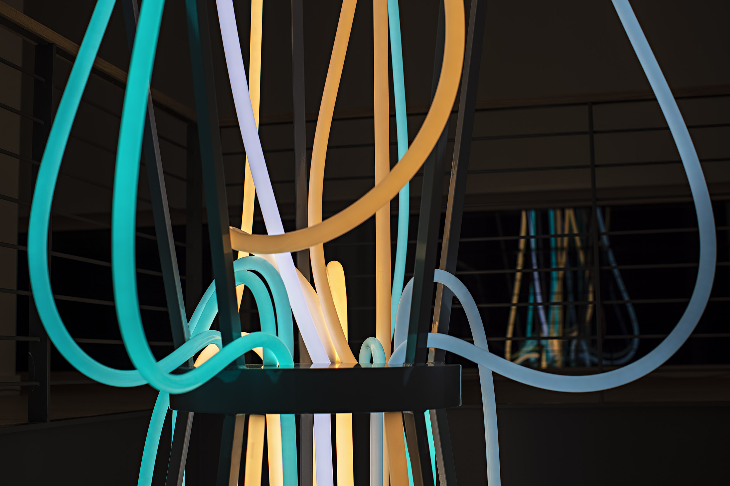 Media: Stainless steel, diffusion material and reflective material, LEDs, custom lighting sequence, and electrical hardware
