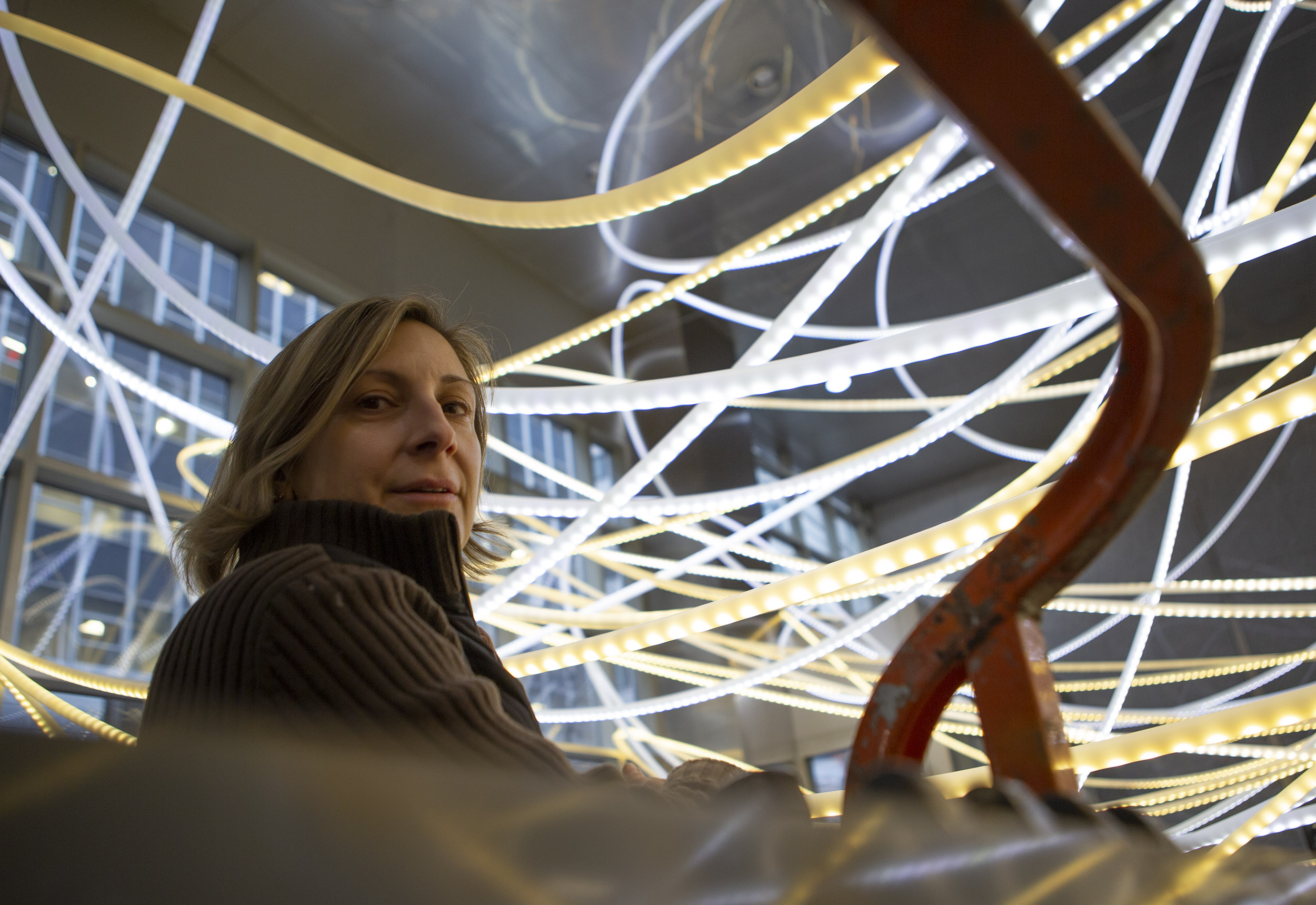 BREATHLESS MAIDEN LANE is a 25-foot light sculpture suspended in the atrium of 125 Maiden Lane in New York’s Financial District, its interlocking matrix of white and gold LED tubing tracing the organic, pre-grid street patterns of Lower Manhattan in a work that captures the exhilarating energy of the city.